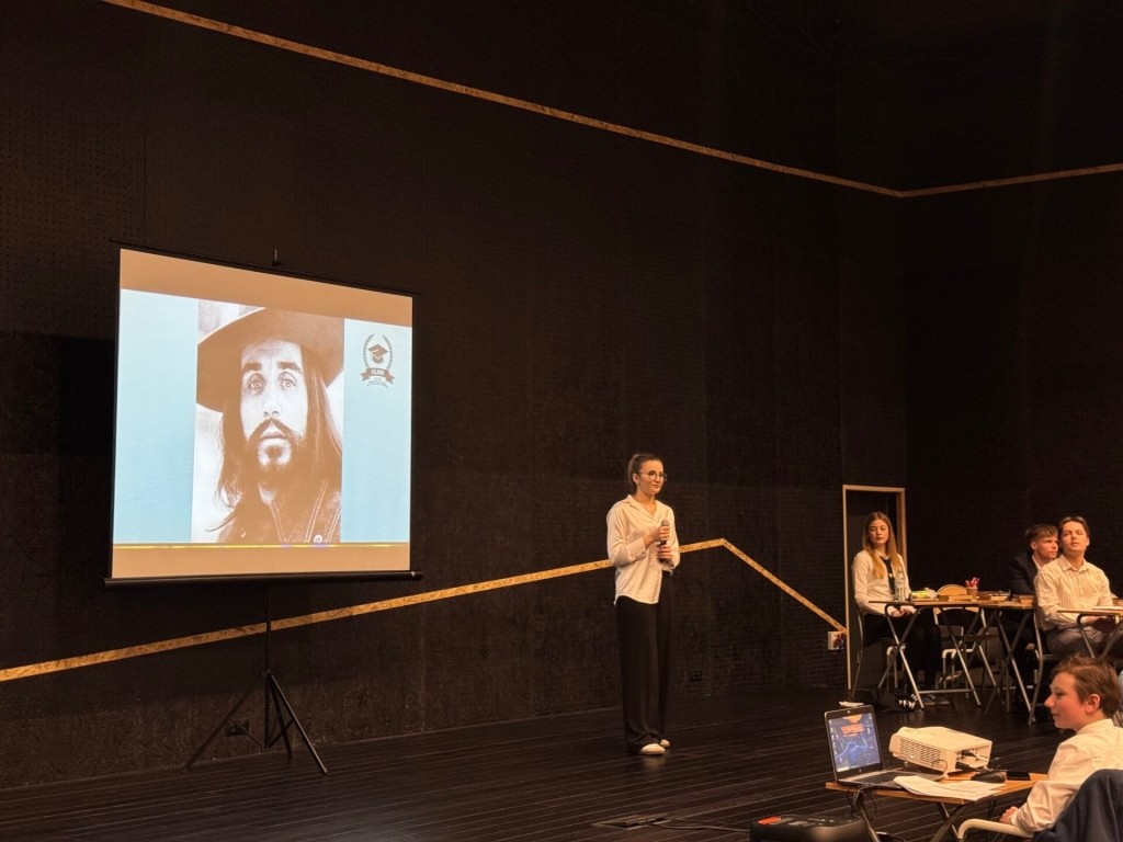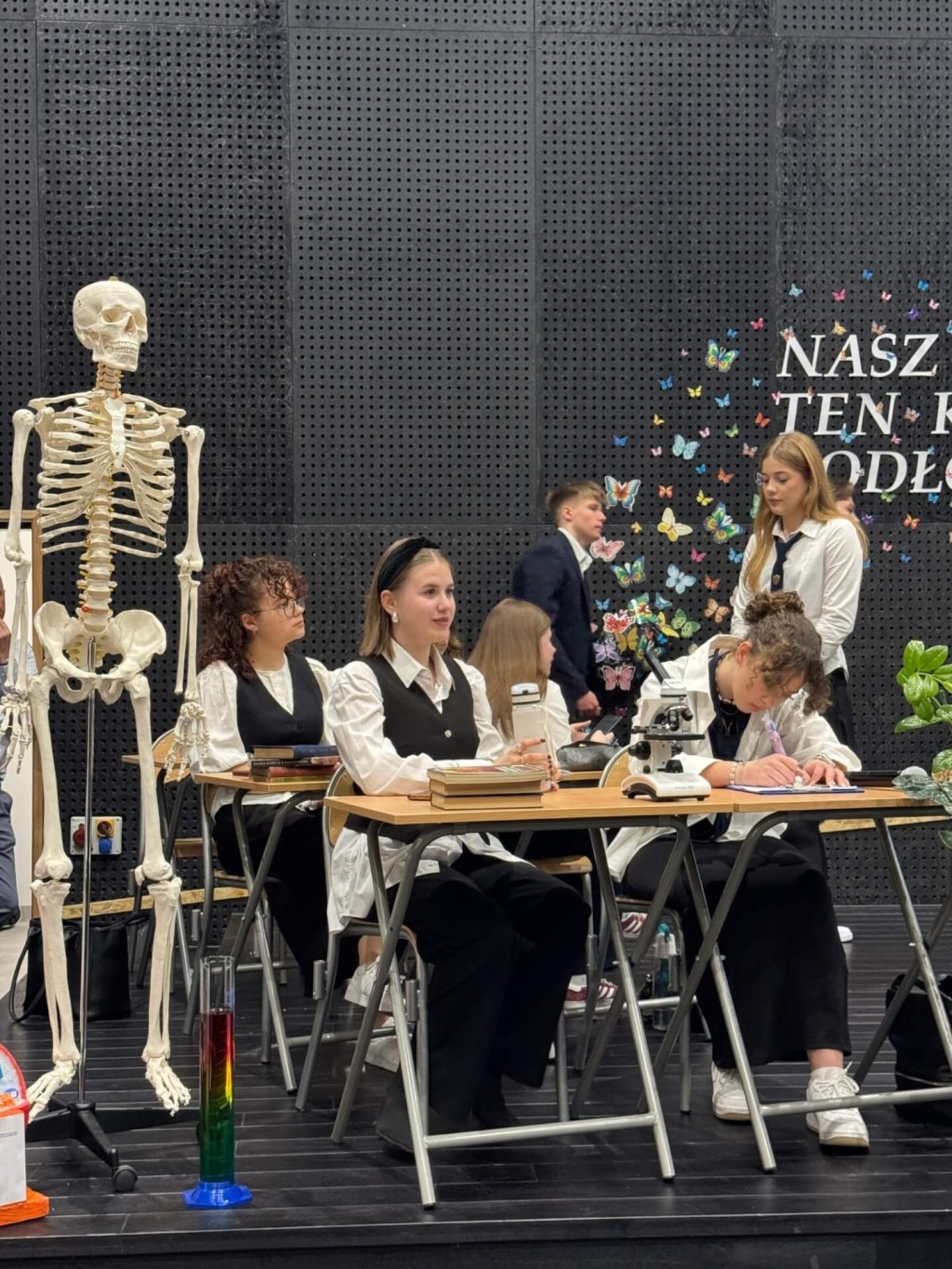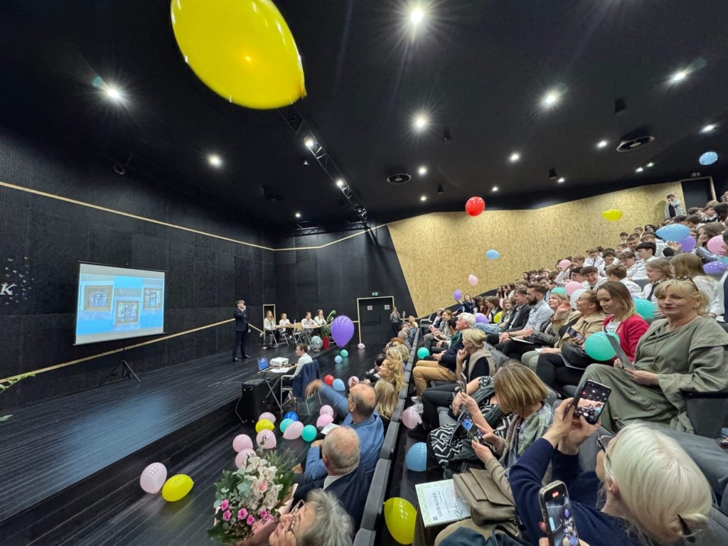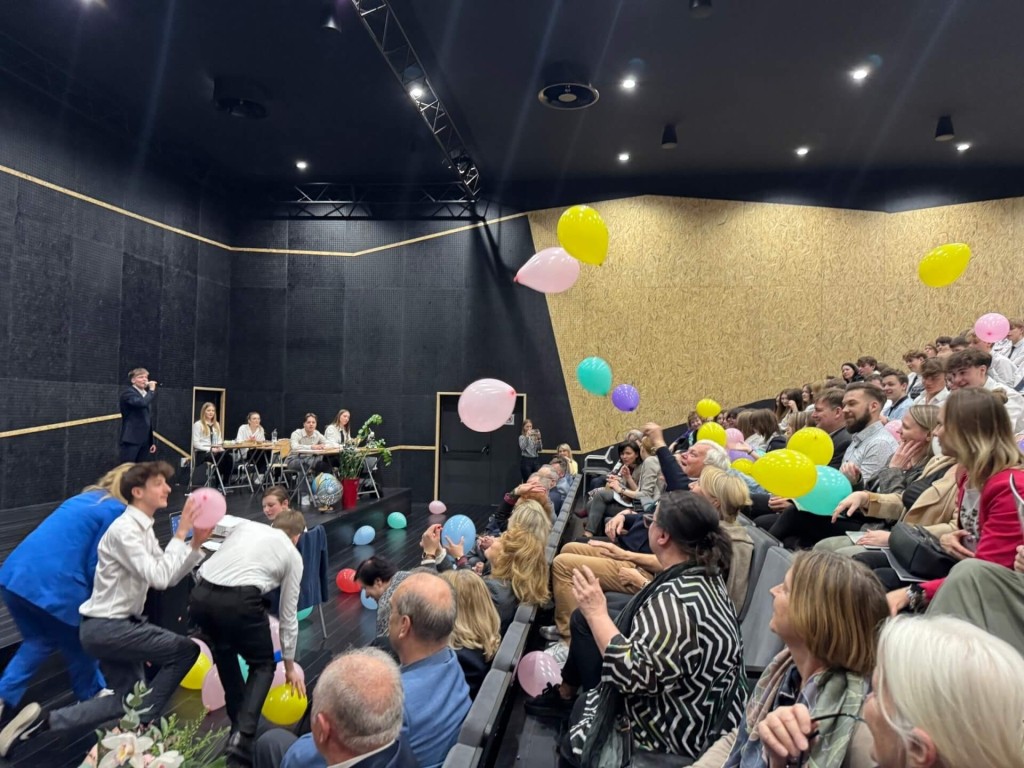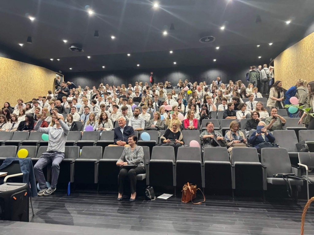 The heart of the building is the school auditorium – austere in its form, finished on the corridor sides with concrete with an OSB impression. Inside the auditorium, the concrete structure remains hidden, dominated by wood and OSB paneling. The hall's distinctive character has made it a favorite meeting place and a recognizable symbol of the school. It was here that students and teachers celebrated the anniversary today, filling the space with laughter, conversation, and energy—using every corner for shared fun and celebration.