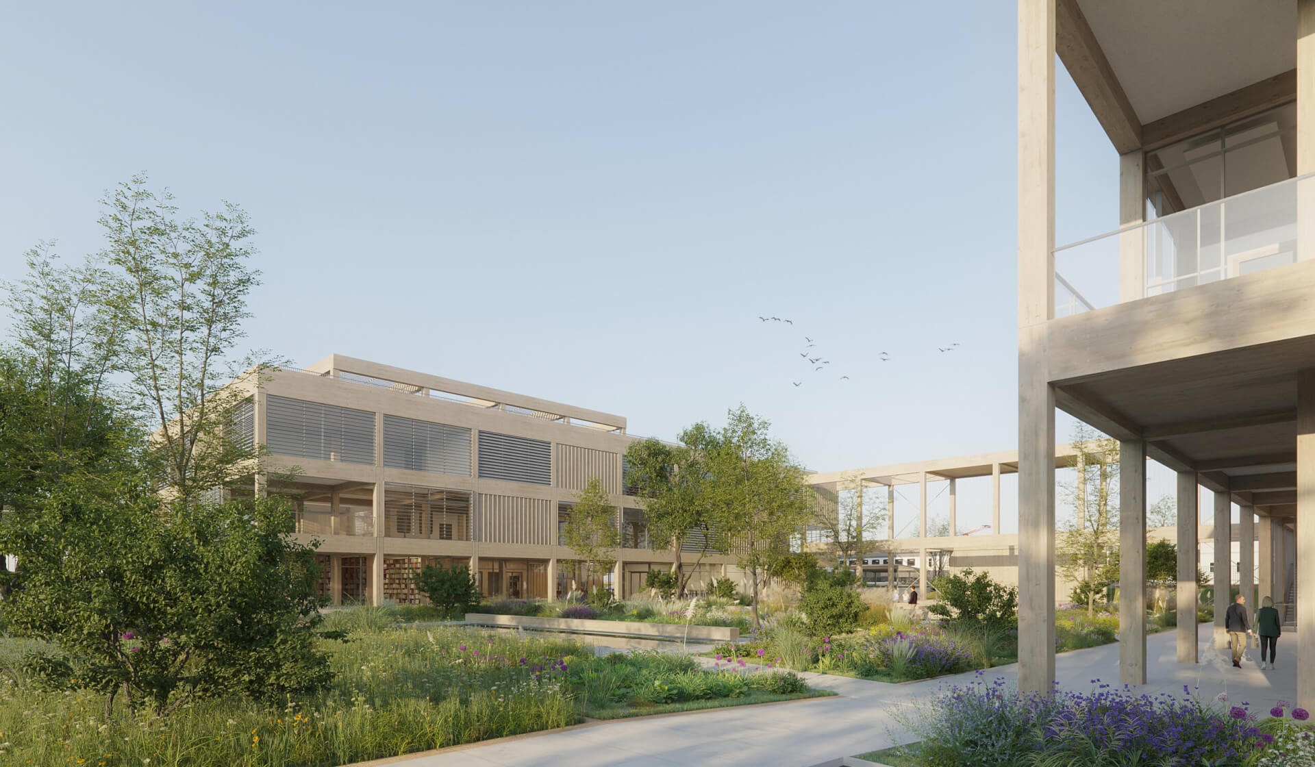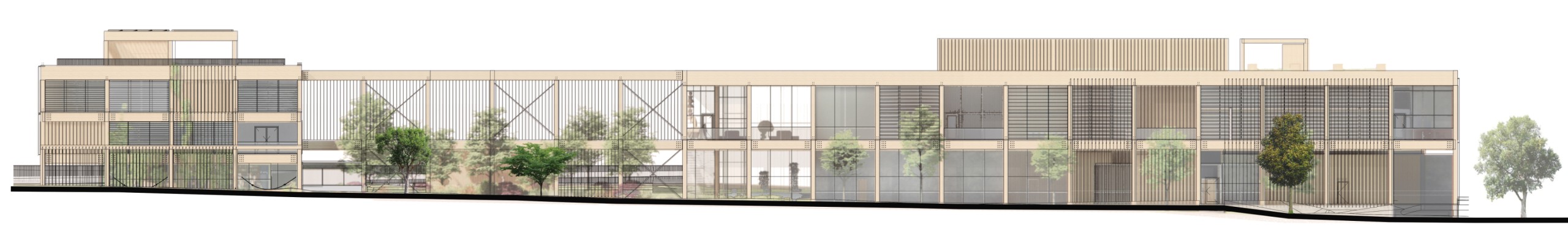 The facade's composition takes the order of the wooden structure as its starting point, but is enriched by its infill. At times, it's the emptiness of the loggia, at others, the glazing of the foyer, at others, a solid wall finished with wood, and at others, sliding blinds – the whole creates a dynamic yet harmonious mosaic embedded in a grid of columns and beams.
