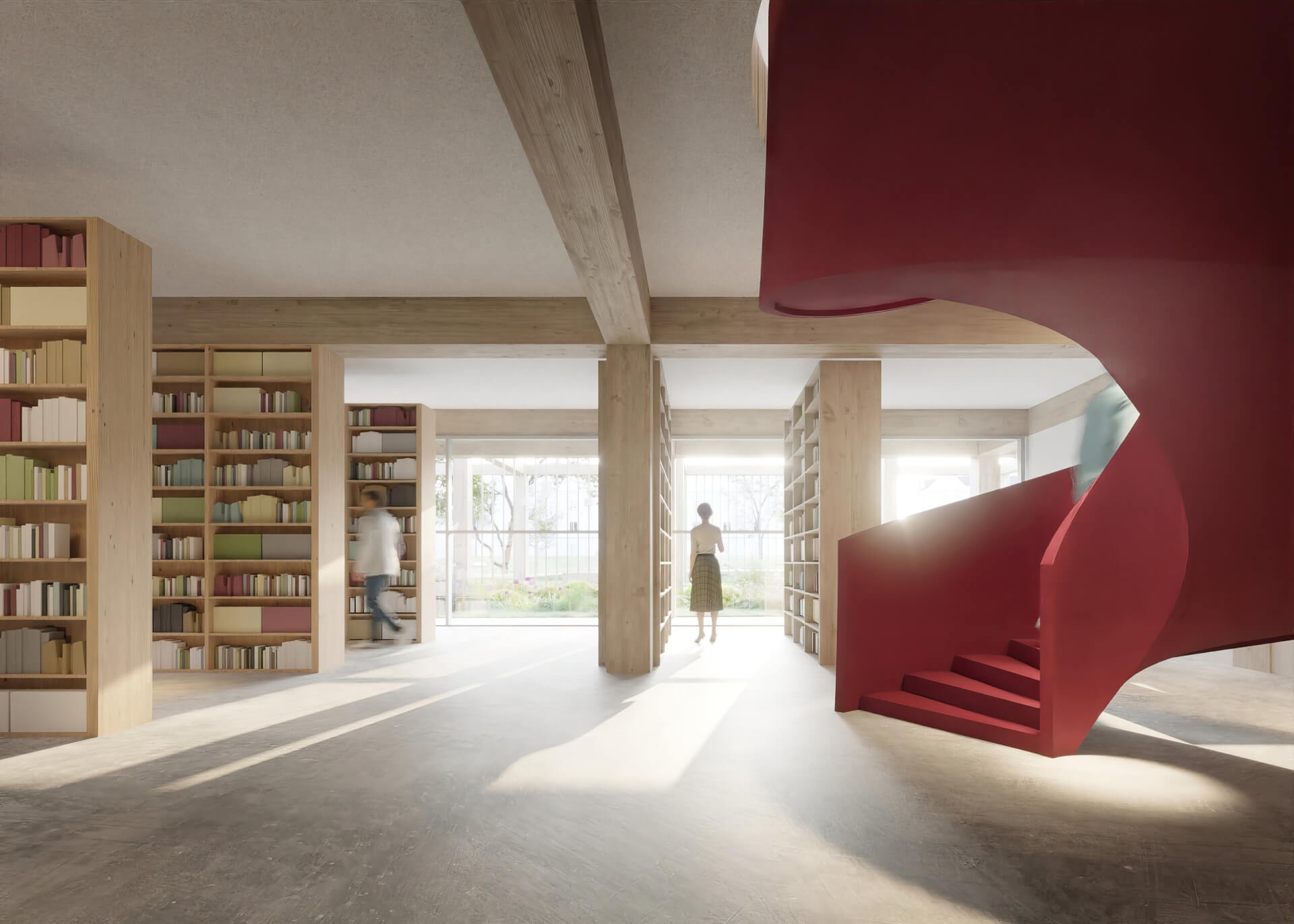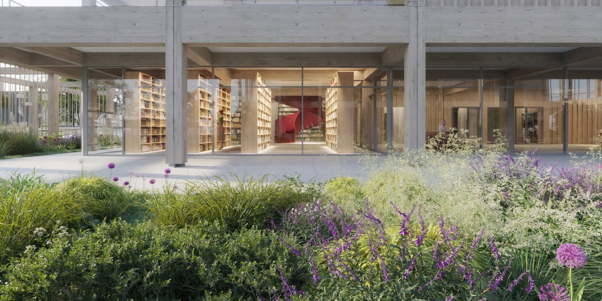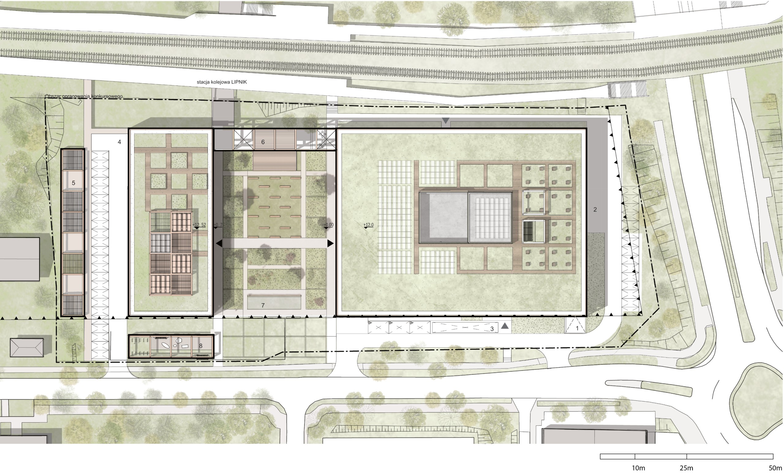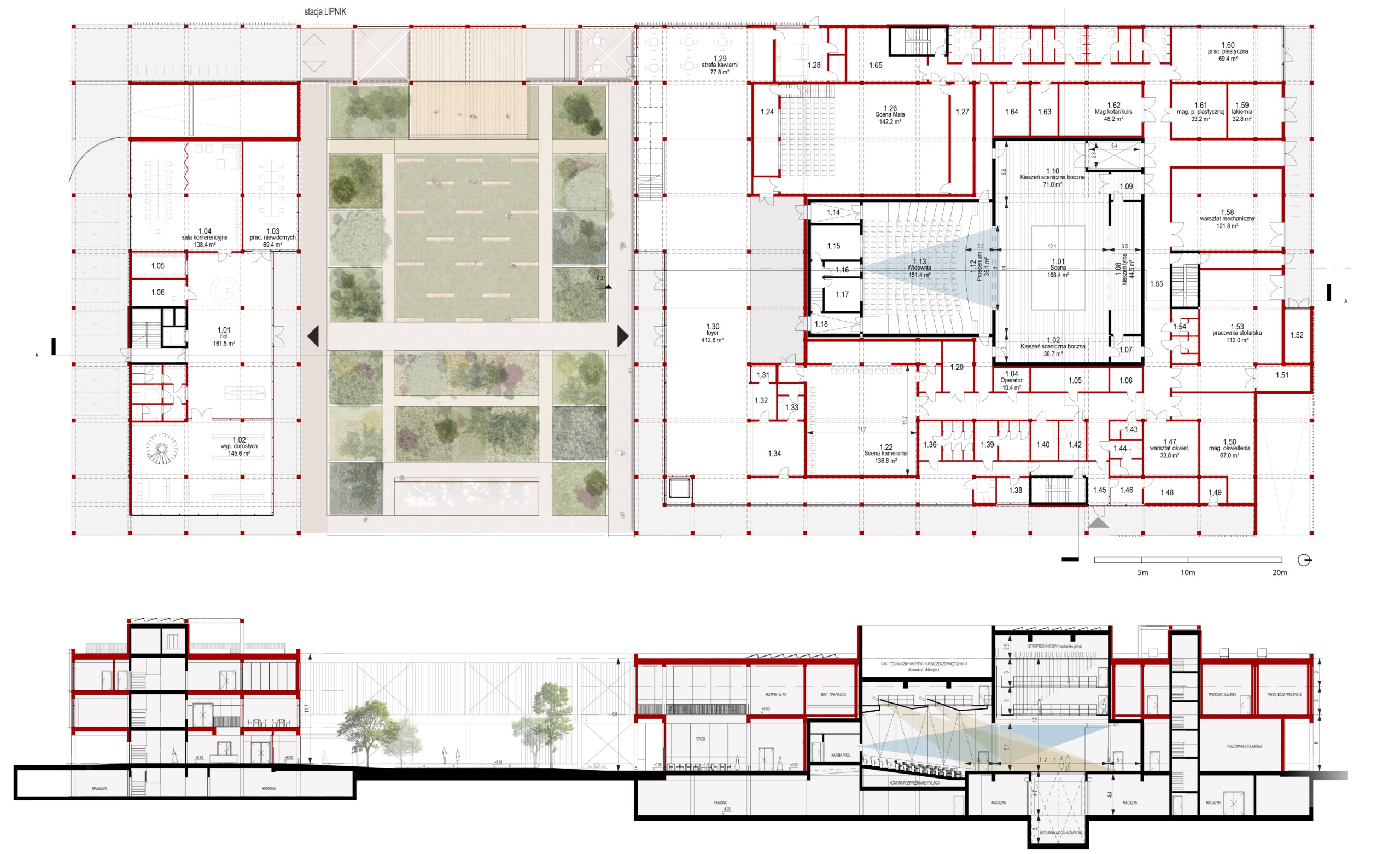 A challenge in creating a complex of two cultural institutions is the multitude of functions that must be considered in and around the buildings. To ensure clarity, keep the scale of the buildings as small as possible, and create multiple spaces with different purposes and character, a decision was made to design two separate buildings. However, they form a whole thanks to a common principle – a regular structure of laminated timber, whose structural grid, based on a 6 x 6 meter module, determines the rhythm and organization of both the volumes, the facades, and even the landscaping elements. The facade composition takes the order of the wooden structure as its starting point, but is enriched by its filling. Sometimes it is the emptiness of the loggia, sometimes the glazing of the foyer, sometimes a solid wall finished with wood, and sometimes sliding blinds. The whole creates a dynamic yet harmonious mosaic inscribed in a grid of columns and beams. Location and urban planning. The specific location of the facility poses challenges, but also offers certain opportunities. The immediate vicinity of the Lipnik railway station is, on the one hand, a nuisance, but on the other, an opportunity to reach the Theatre and Library by public transport, forgoing the car. Therefore, the creation of a path along the axis of the existing underpass beneath the station was crucial for the urban planning. This also helps maintain and enhance the pedestrian connection between the two residential estates separated by the tracks. The entrance square was deliberately located deep within the layout, away from the nearby viaduct and roundabout. Bounded on two sides by the facades of the Library and Theater, it is separated from the tracks by a continuation of the wooden structure housing the covered summer stage. This intimate interior is filled with intense greenery – medium-height, high, and low – and there is also plenty of water. The square's two main axes are a wide path connecting the main entrances to the buildings and an axis running from the center of the stage to the perpendicular street. The summer stage audience area is designed as a multi-purpose area – sown with grass instead of paving, and in the summer months, in addition to benches, it may be equipped with deckchairs or even blankets.