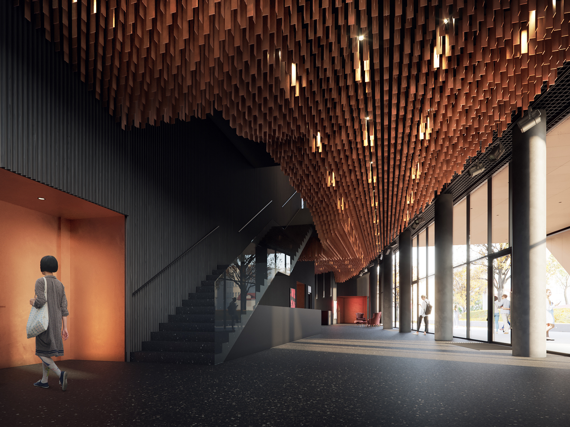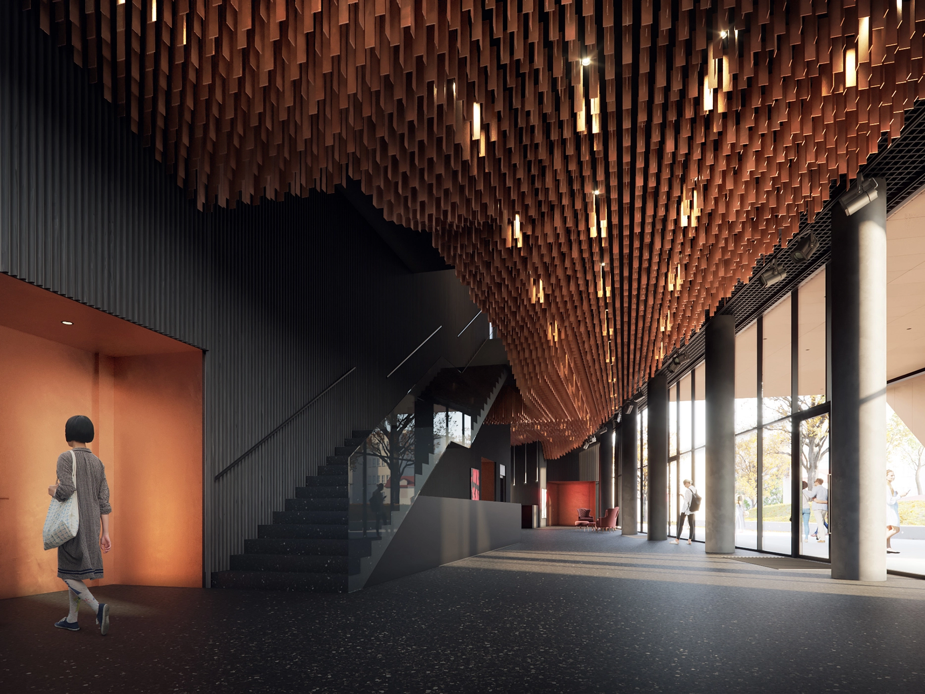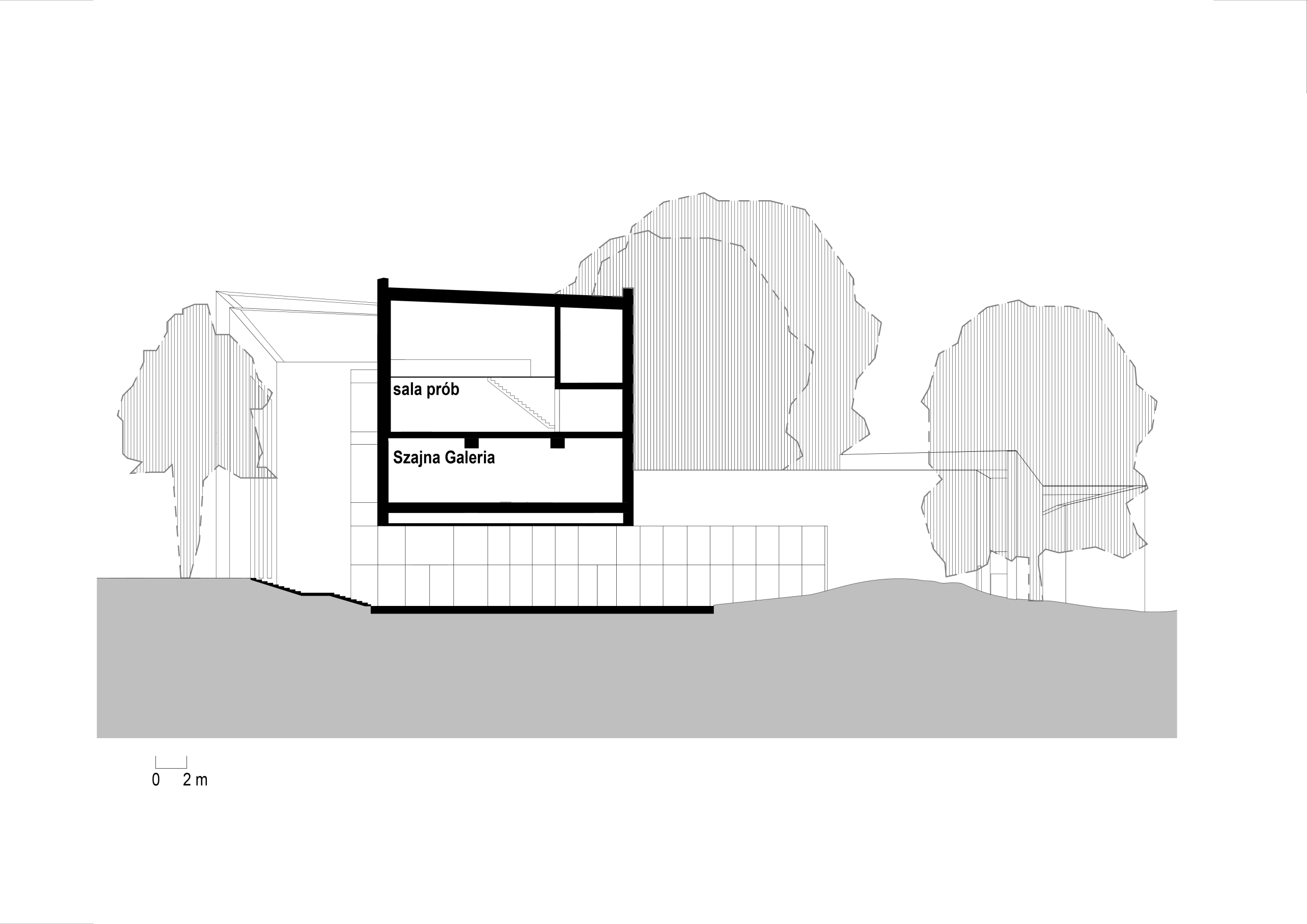 - A café, exhibition space, rehearsal room, dressing rooms, guest rooms, and administrative offices;