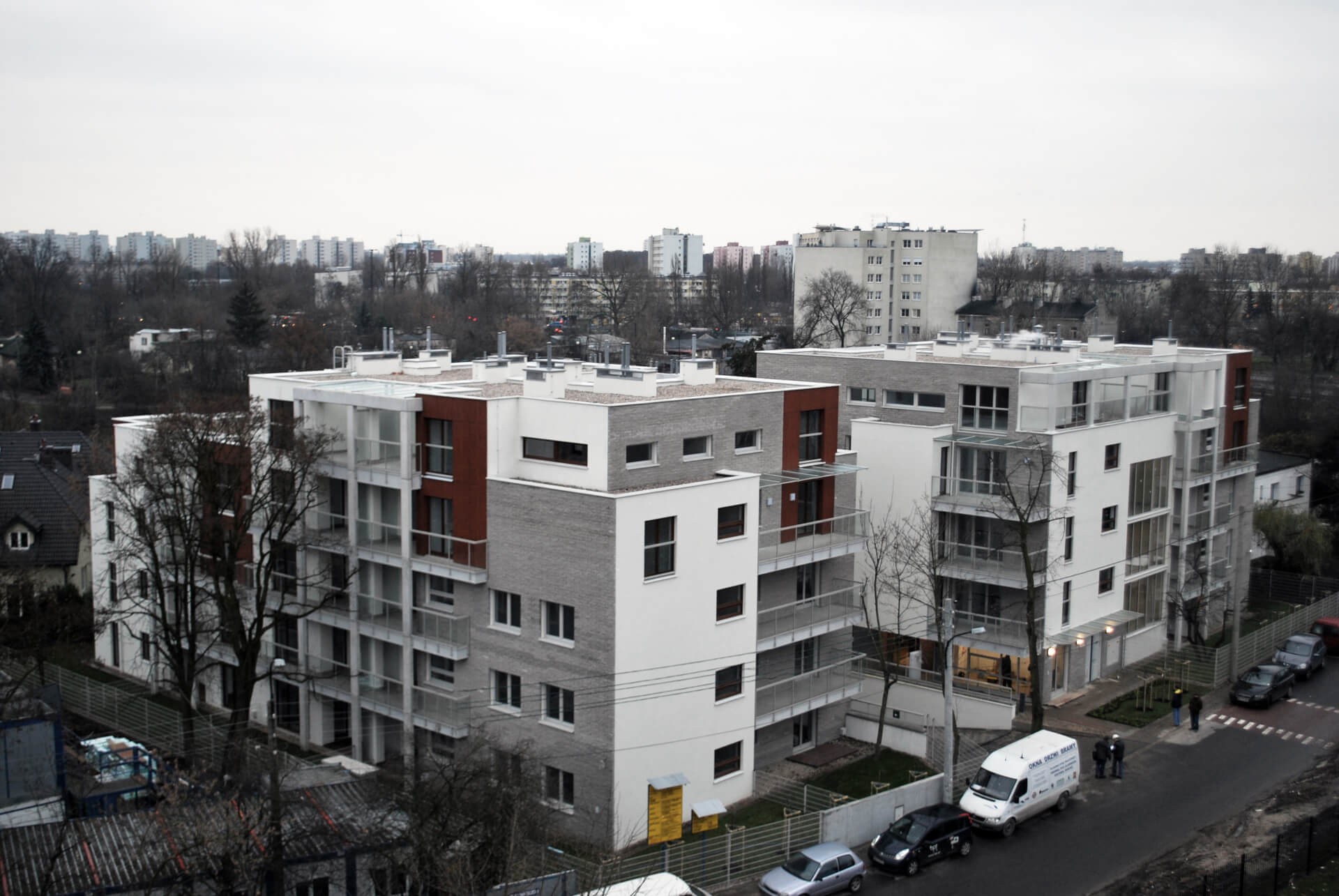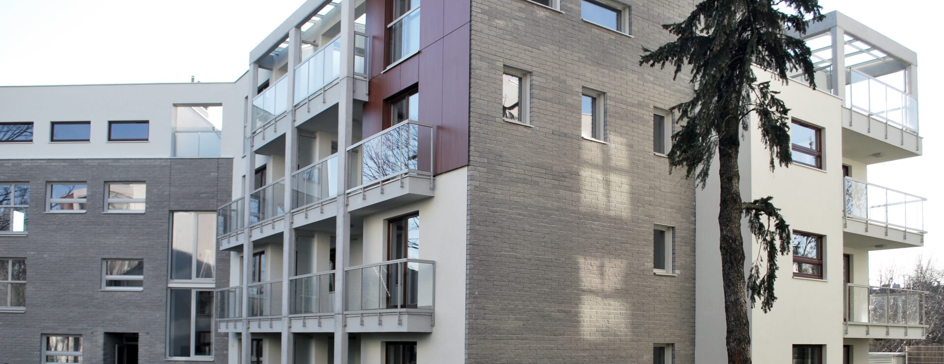 The architecture of the complex is based on simple, contemporary forms, with façades clad in light gray split concrete brick. This material, whose appearance shifts with the sunlight, produces a subtle, dynamic play of light and shadow. Complementing the design are spacious architectural concrete elements, suspended from balcony slabs, which add plasticity and rhythm to the overall composition.