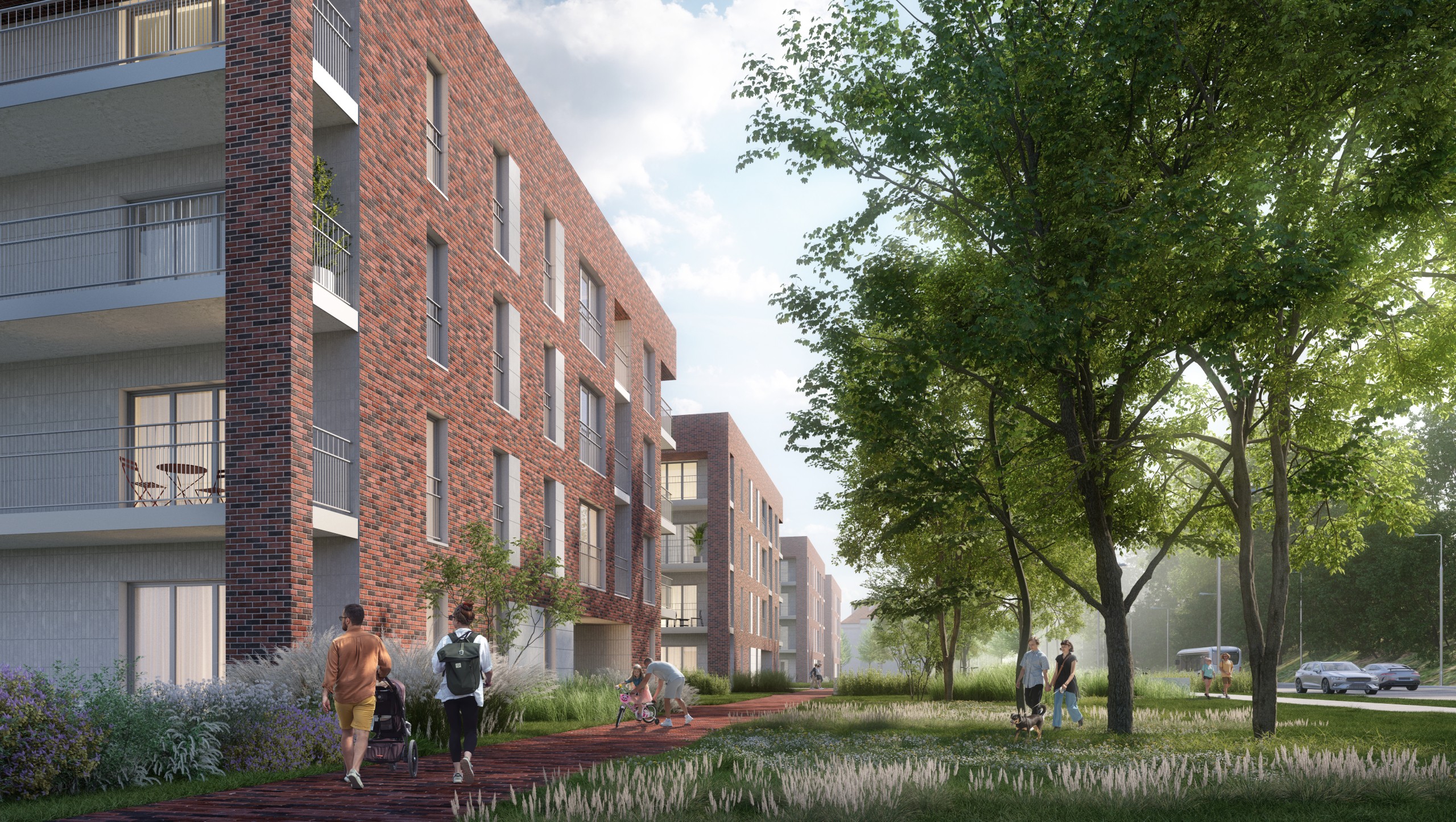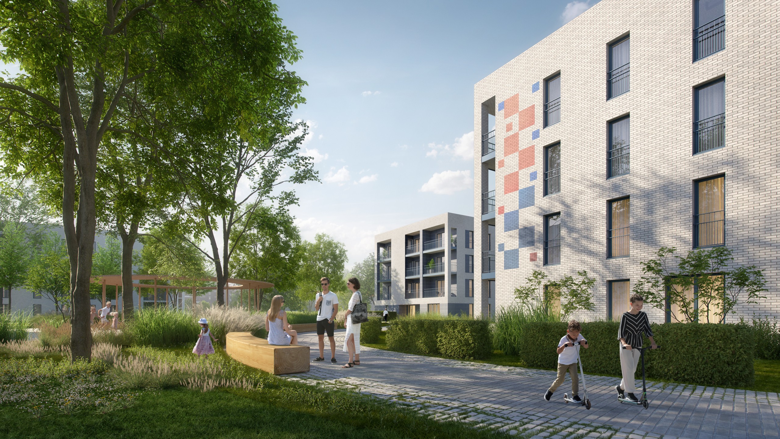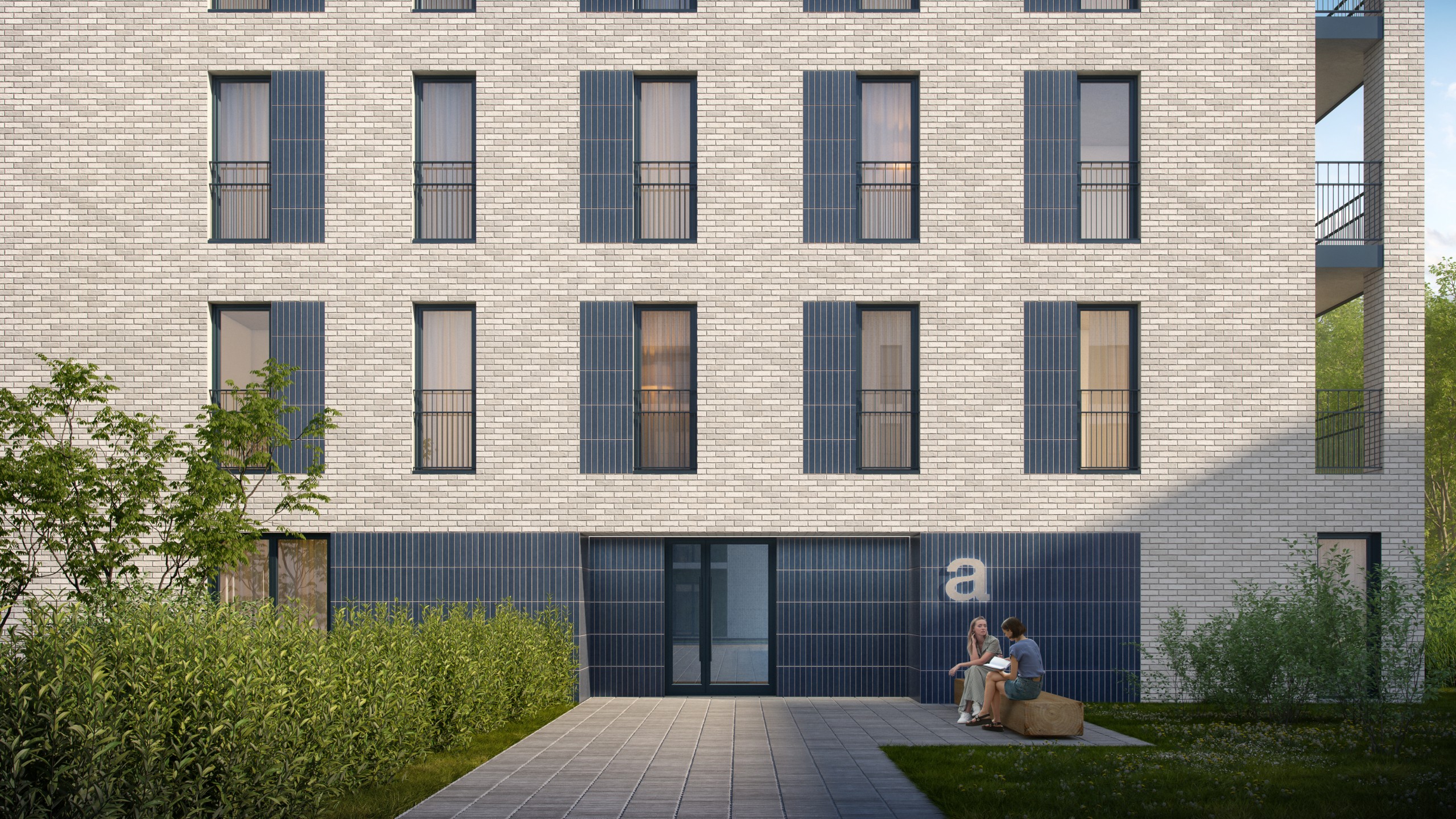 The architecture of the buildings is based on simple, modular forms, enriched with rhythmic loggias and recessed entrances. A key feature is the use of concrete brick façades, complemented by ceramic details in shades of green, navy, and rusty burgundy. These motifs are enhanced by brick murals inspired by Silesian patterns, adding subtle accents that build the identity of the place.