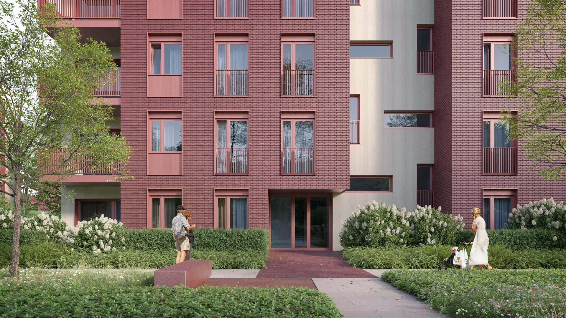 The external facades are finished with brick tiles, while the interior side of the quarter features light-colored plaster, emphasizing the difference between the urban and garden sides.