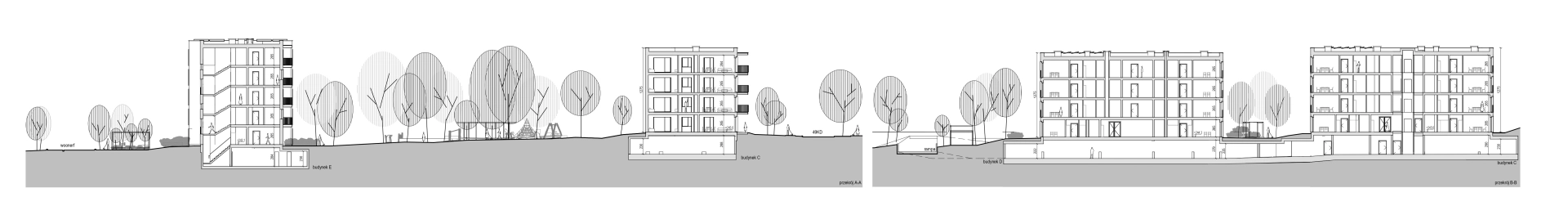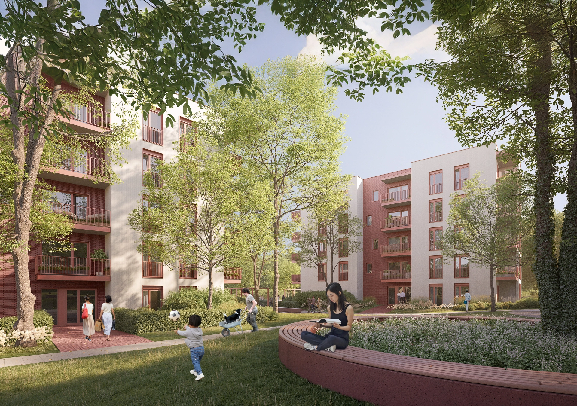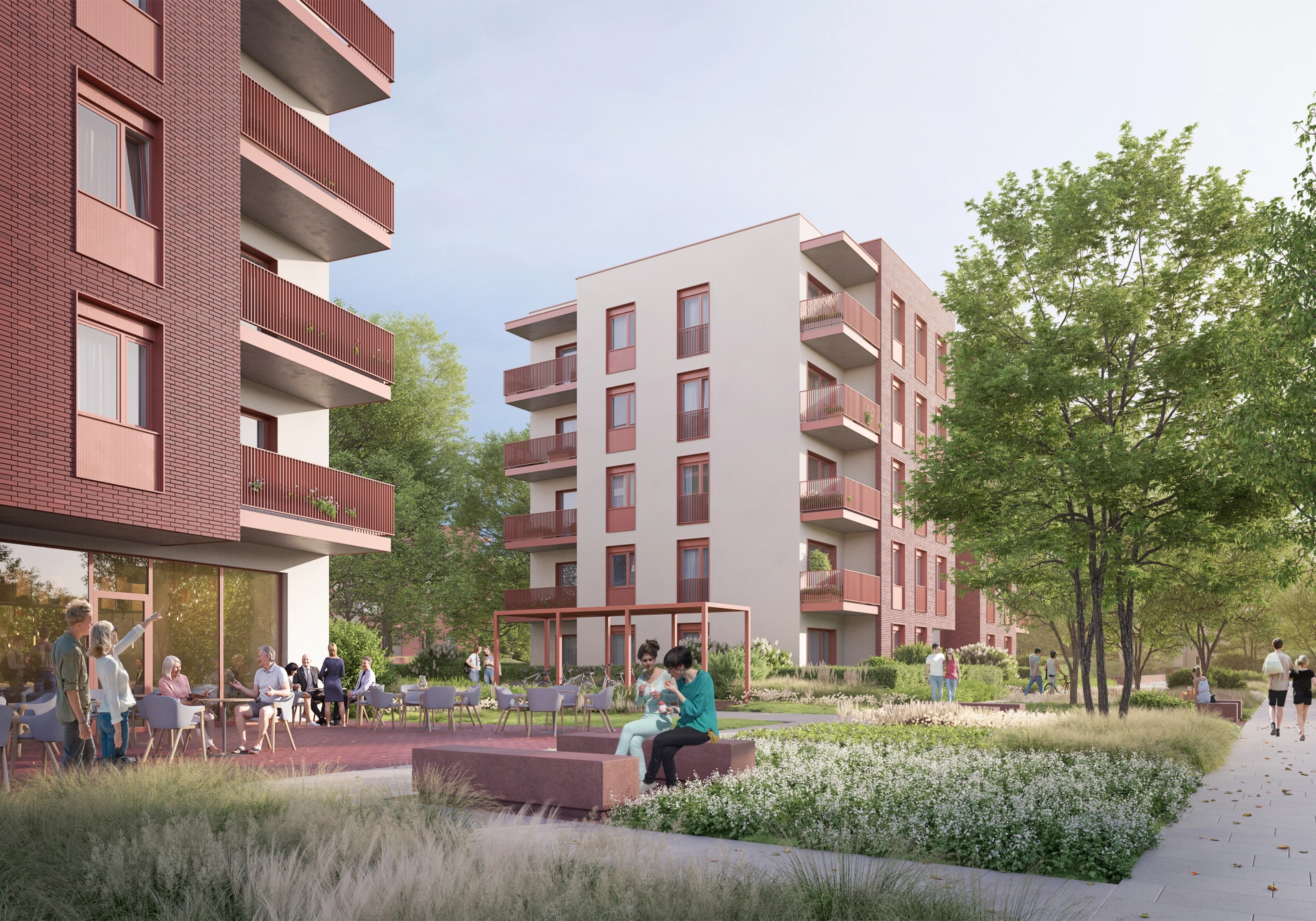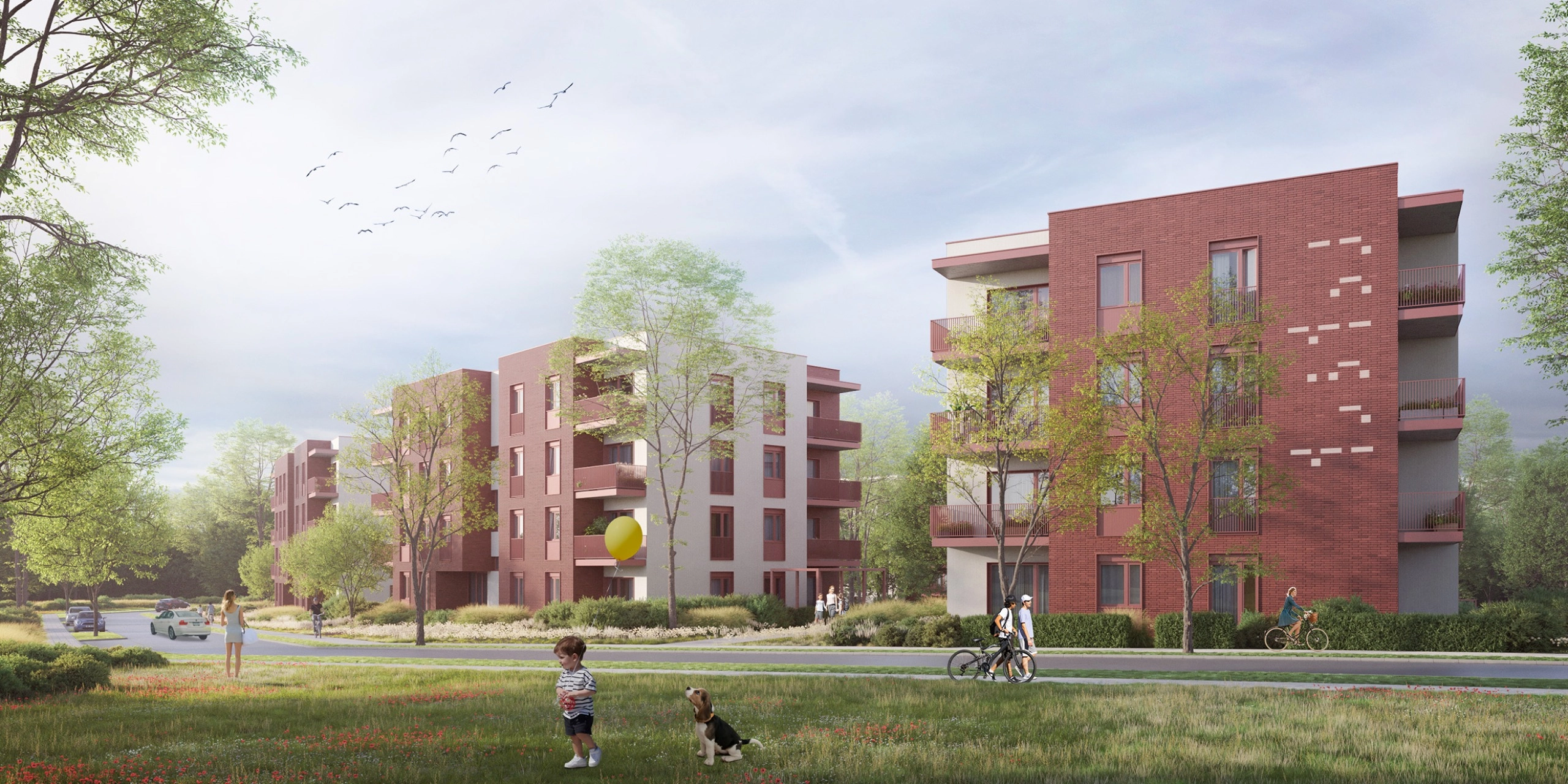 The project envisages a coherent quarter of buildings with a central courtyard – a green space that is the heart of the estate and a meeting place for its residents. Compact, low-rise buildings are arranged around the garden, creating a clear and intimate urban layout.