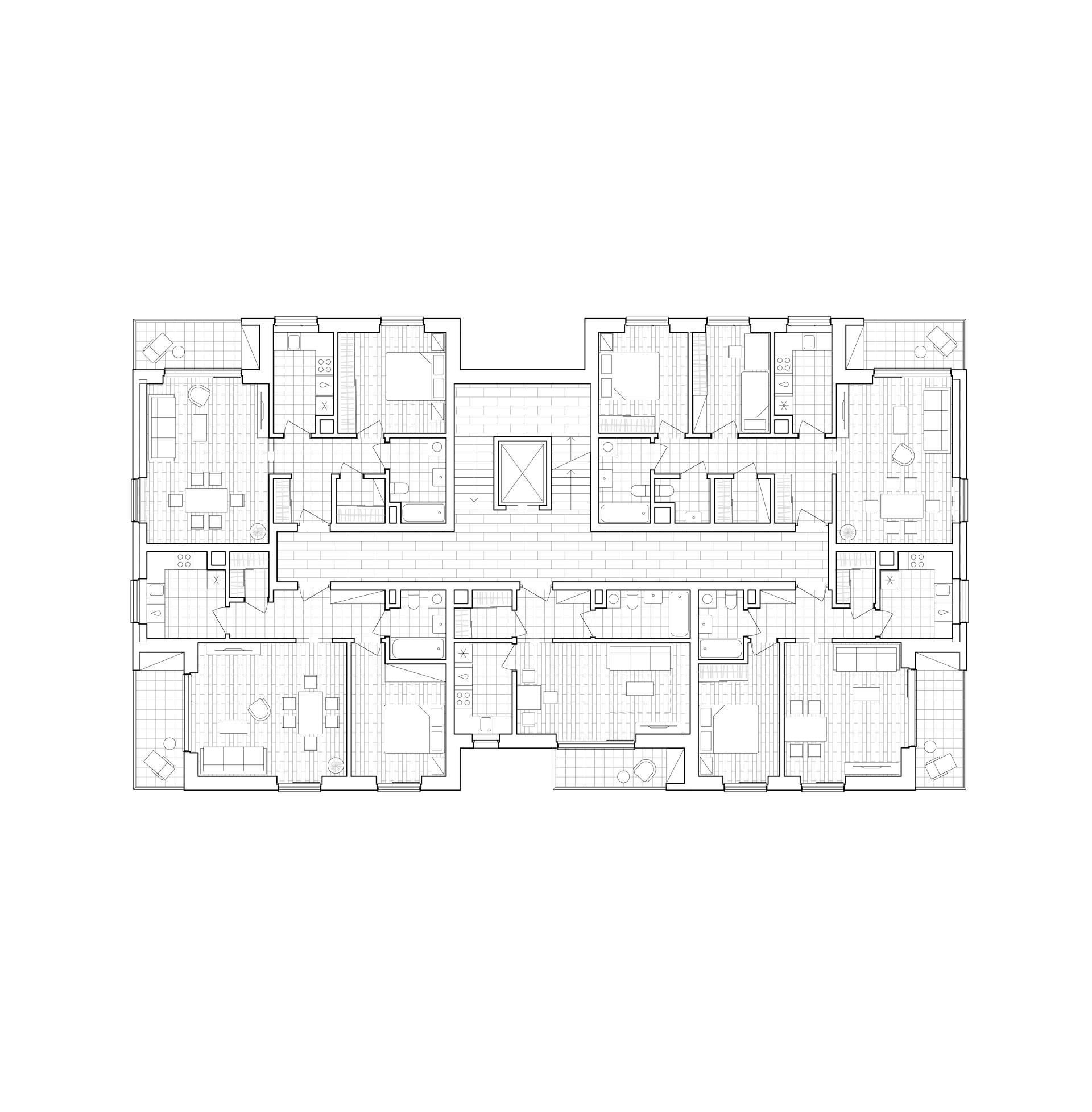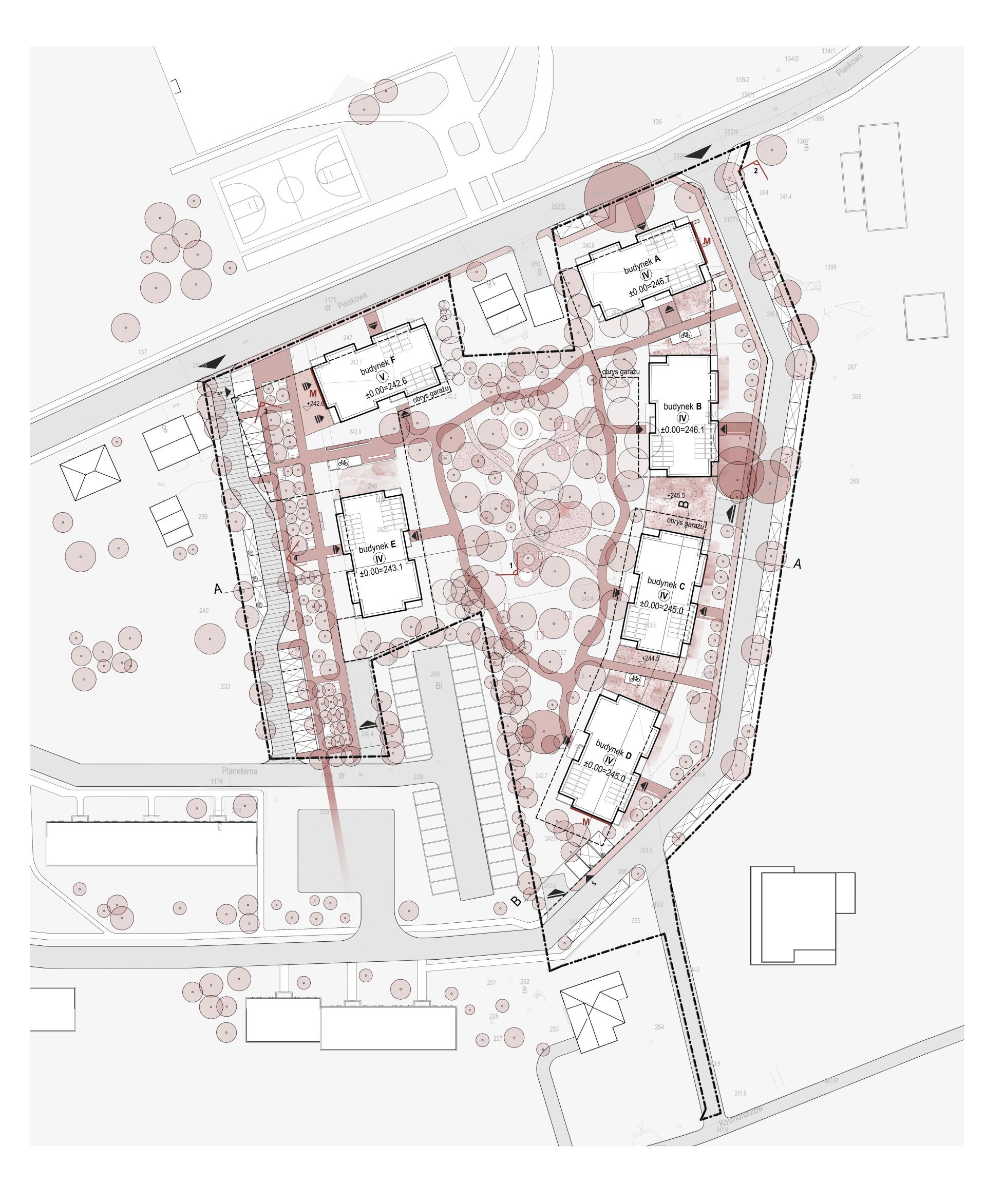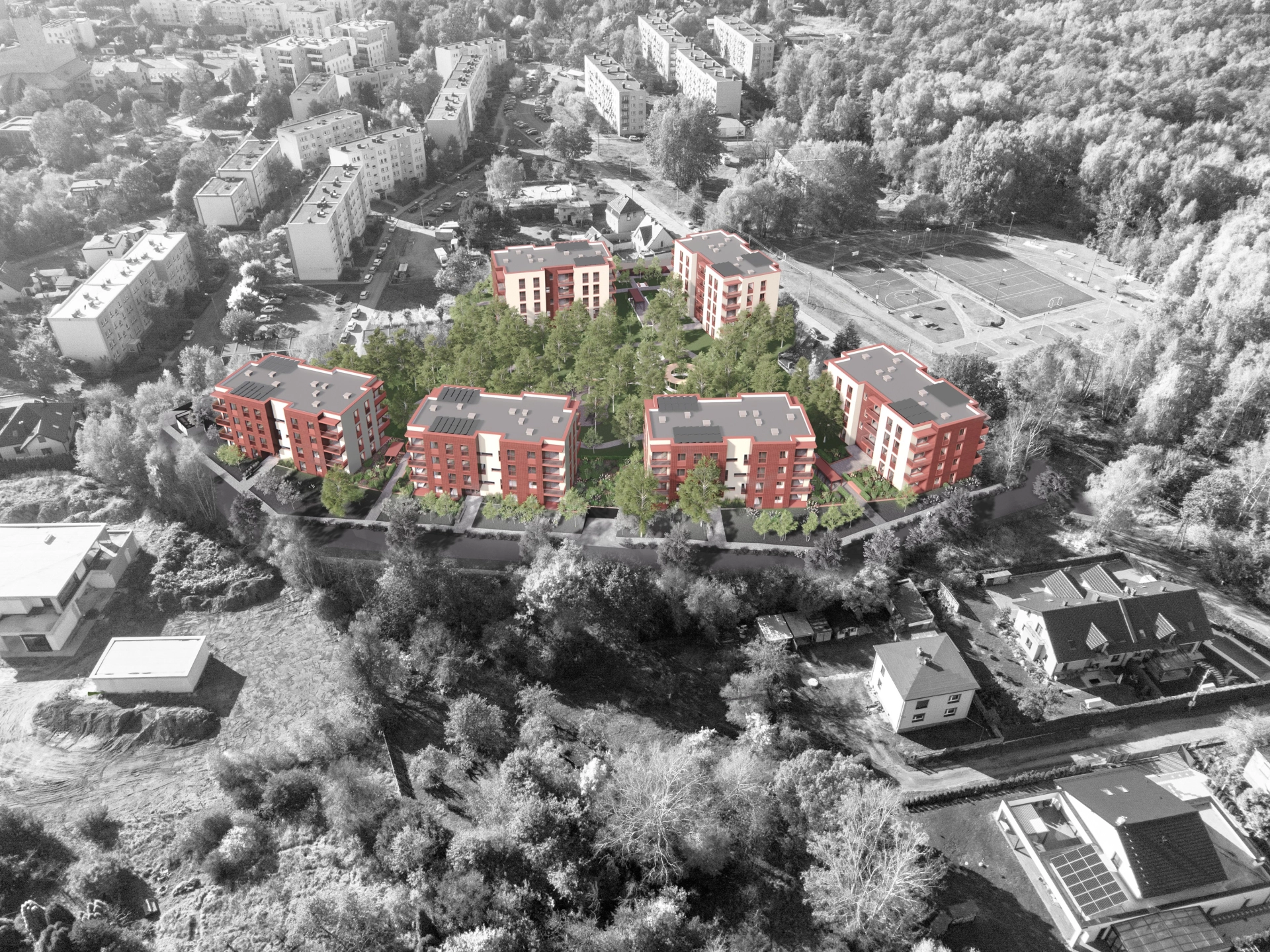 The key idea of the project is to create a residential quarter with a central, publicly accessible courtyard – a green central space of the estate, where the maximum number of existing trees has been preserved, harmoniously integrating the whole into the surrounding urban structure.