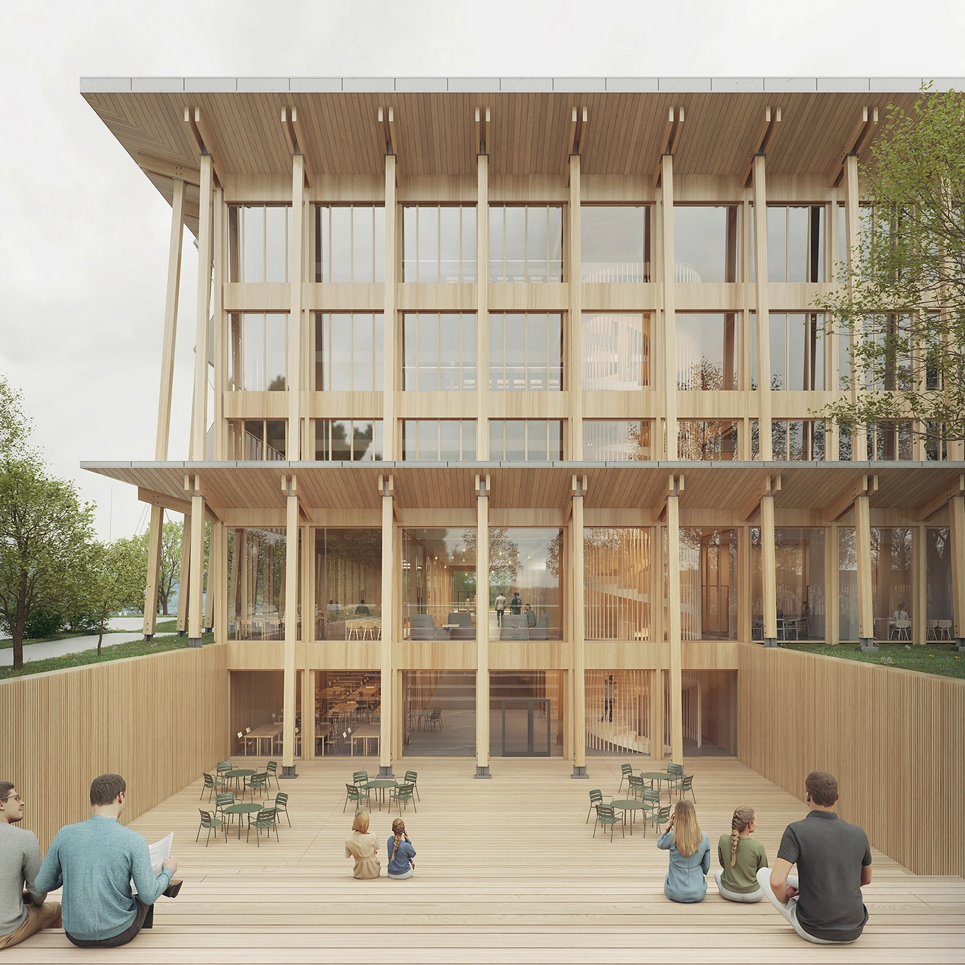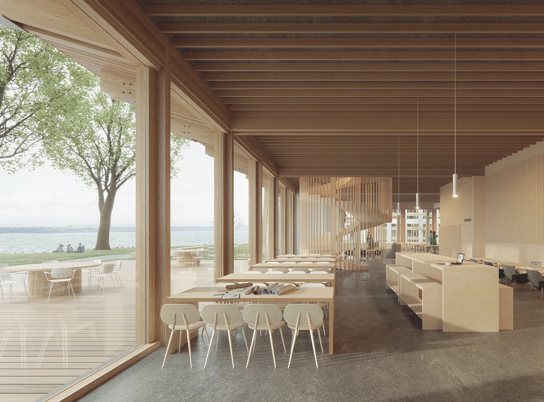 The functional layout is designed for intuitive navigation—users can orient themselves effortlessly and reach their destination without confusion. At the heart of the building lies an adaptable lecture hall and the "green lungs" of Gaia—a glazed internal courtyard. Circulation is further supported by a continuous covered terrace that wraps around the building, complemented on the lake-facing side by a café terrace.