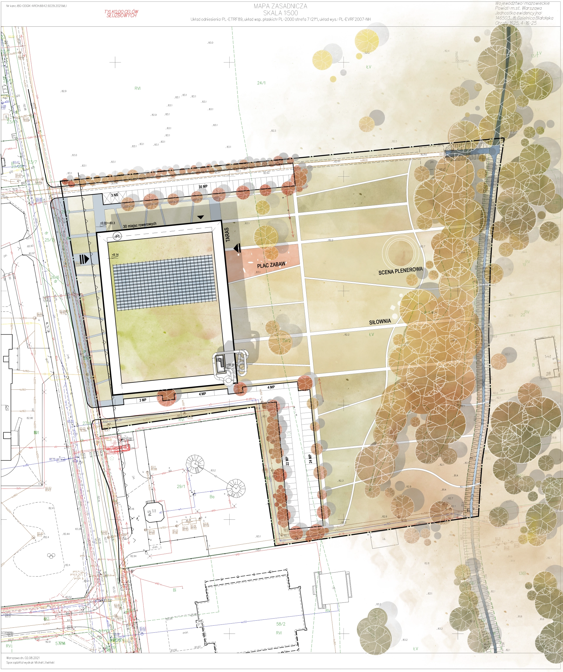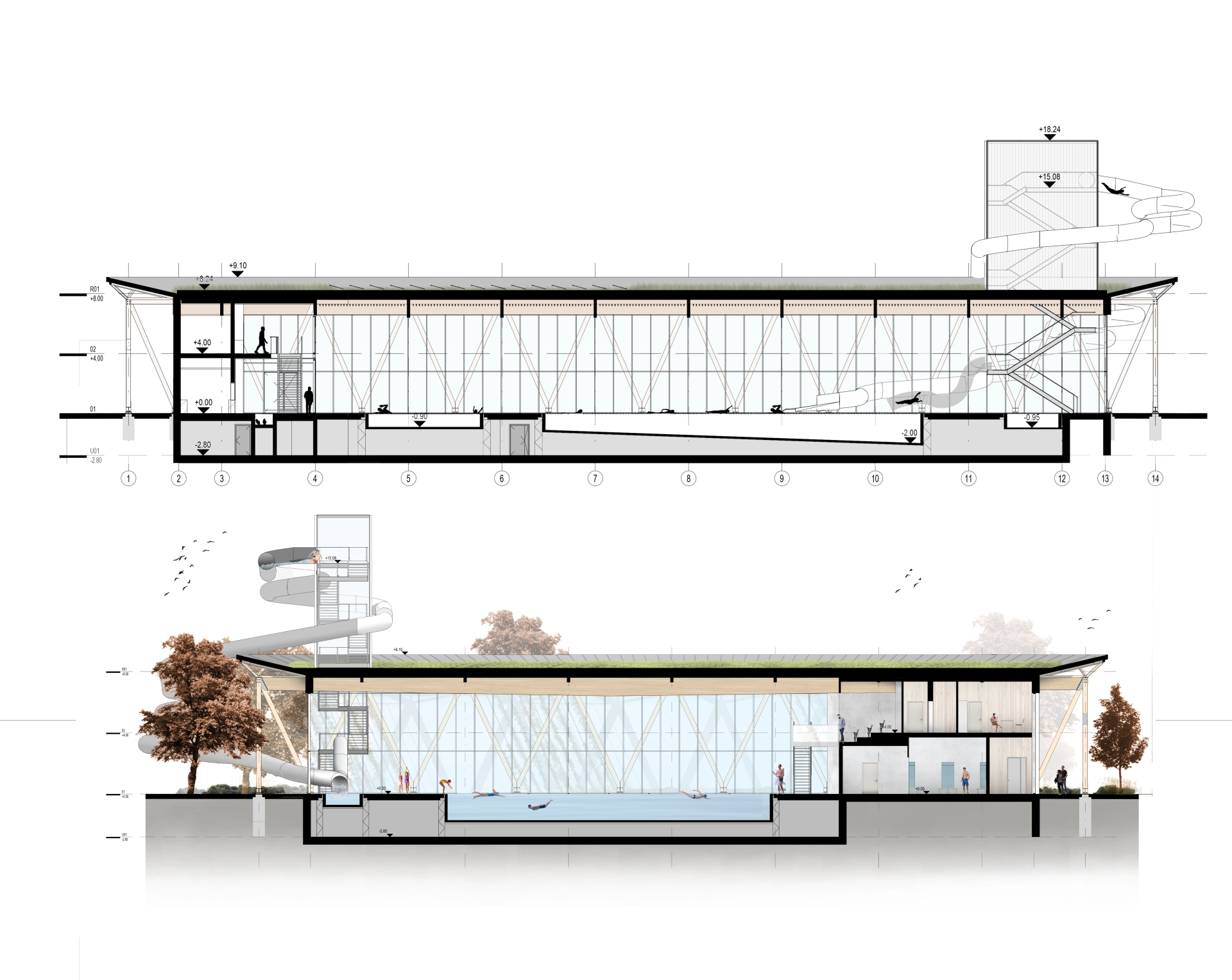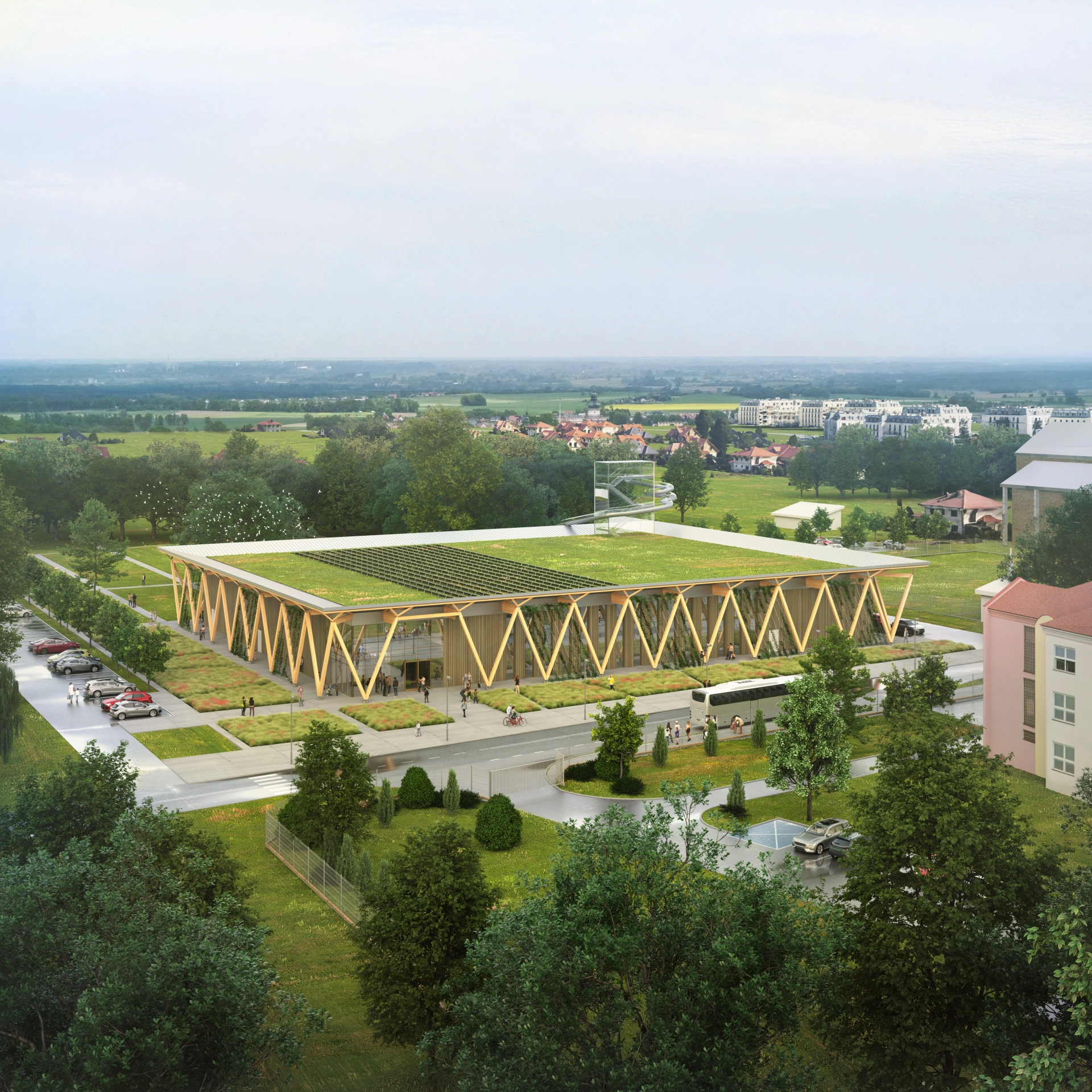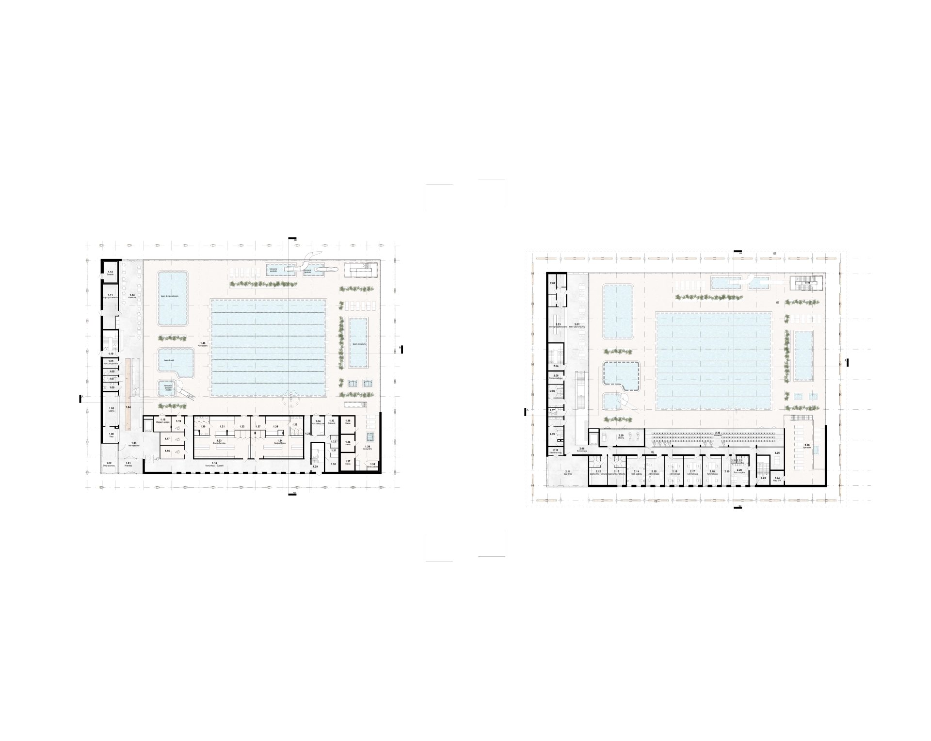 The swimming pool in Białołęka is not only a sports facility, but above all an open, social space, a “neighborhood arcade” combining recreational, educational, and community functions. The wooden structure of the building is surrounded by a publicly accessible colonnade, which serves as a sheltered zone for meetings, workshops, and local events, blending with a park full of meadows, trees, and a natural watercourse.