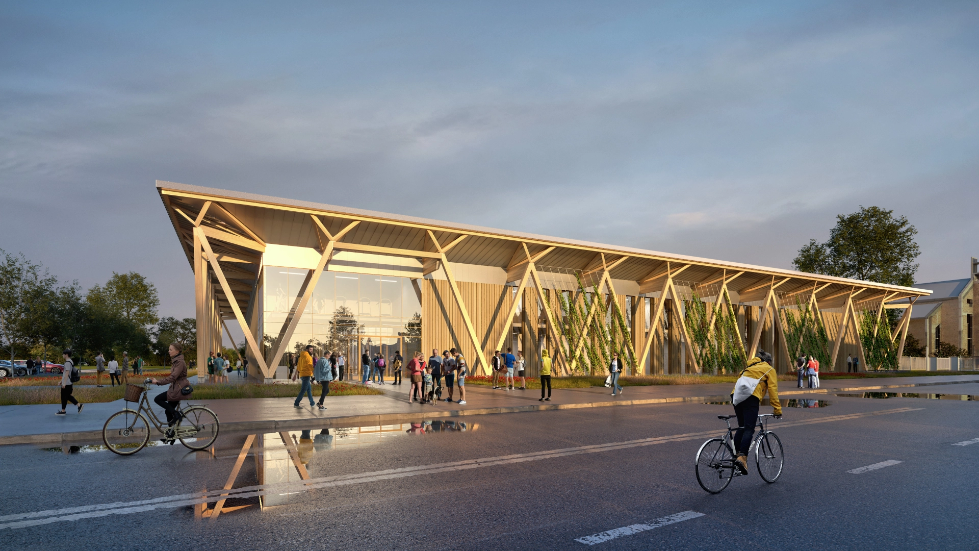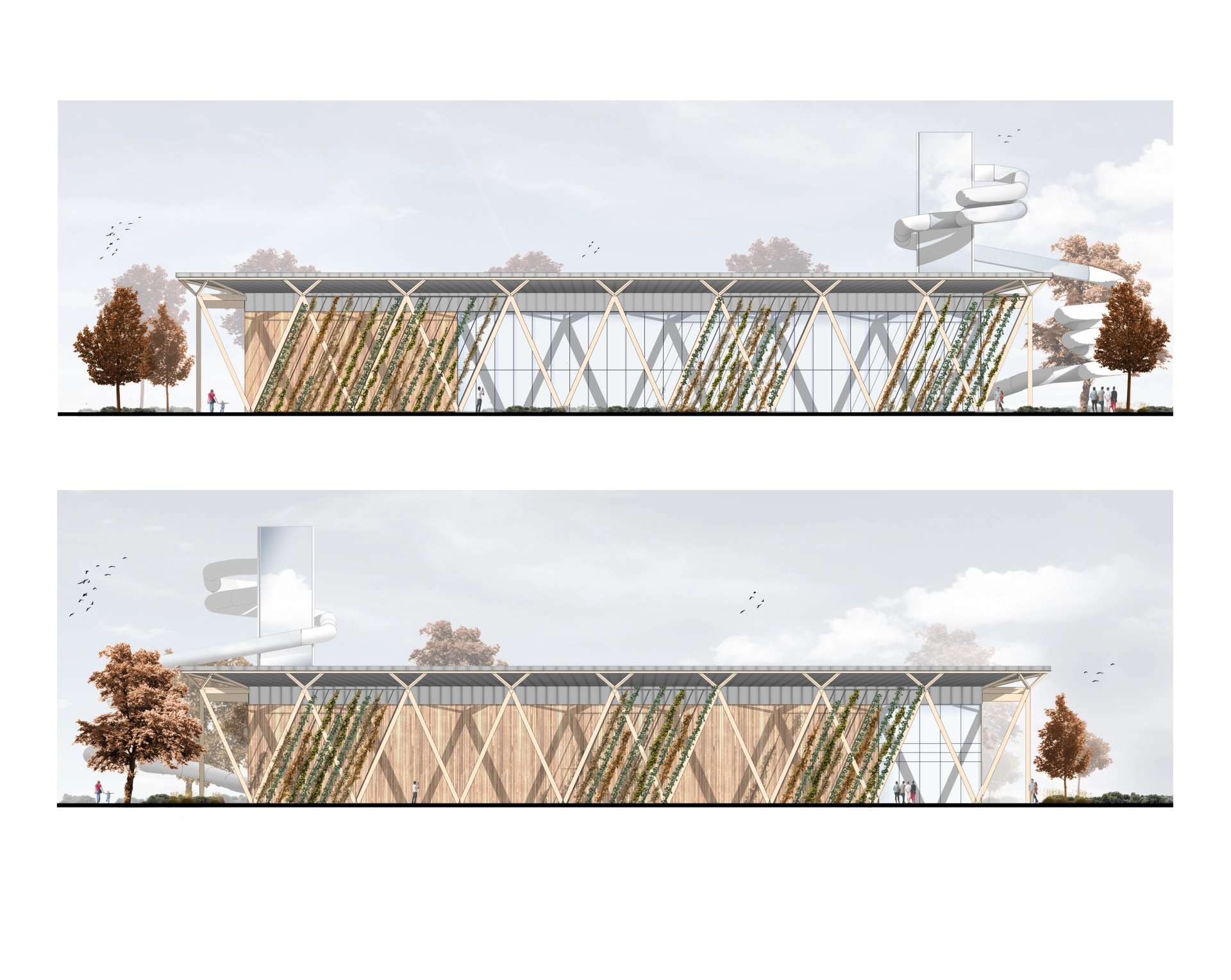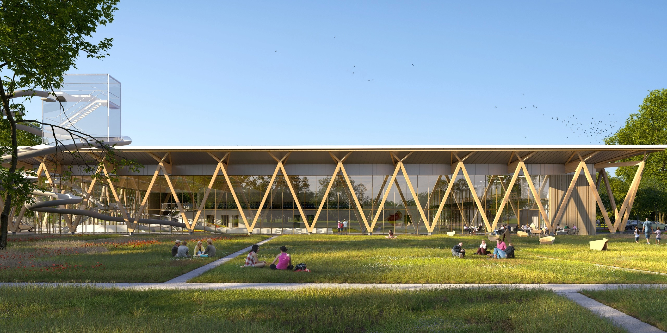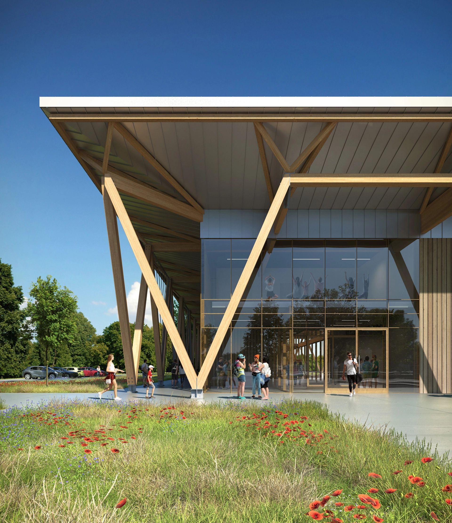 The spatial layout is simple nd clear, preserving as much green area as possible and maintaining visual openness to the north. The whole is complemented by a prefabricated timber structure with a low carbon footprint, enabling rapid assembly and potential phased construction. The result is a design for a modern, inclusive meeting place where architecture harmoniously intertwines with nature and the local community.