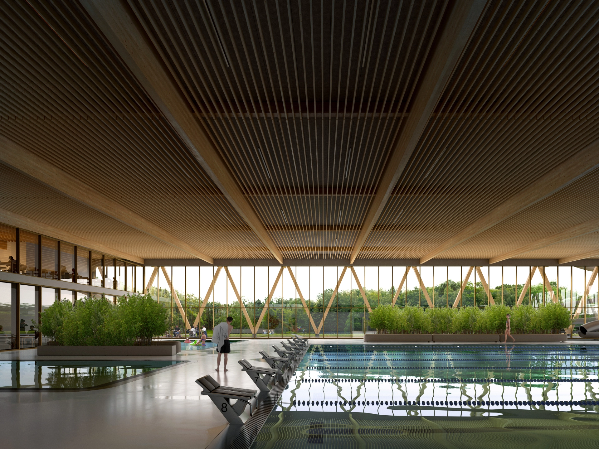 The foyer of the swimming pool is shaped as a visual axis running through the building, opening onto greenery and the park while also allowing views of the pool hall. The interiors are kept in a warm, natural aesthetic of wood and green tones, creating a welcoming microclimate with a feeling of closeness to nature.
