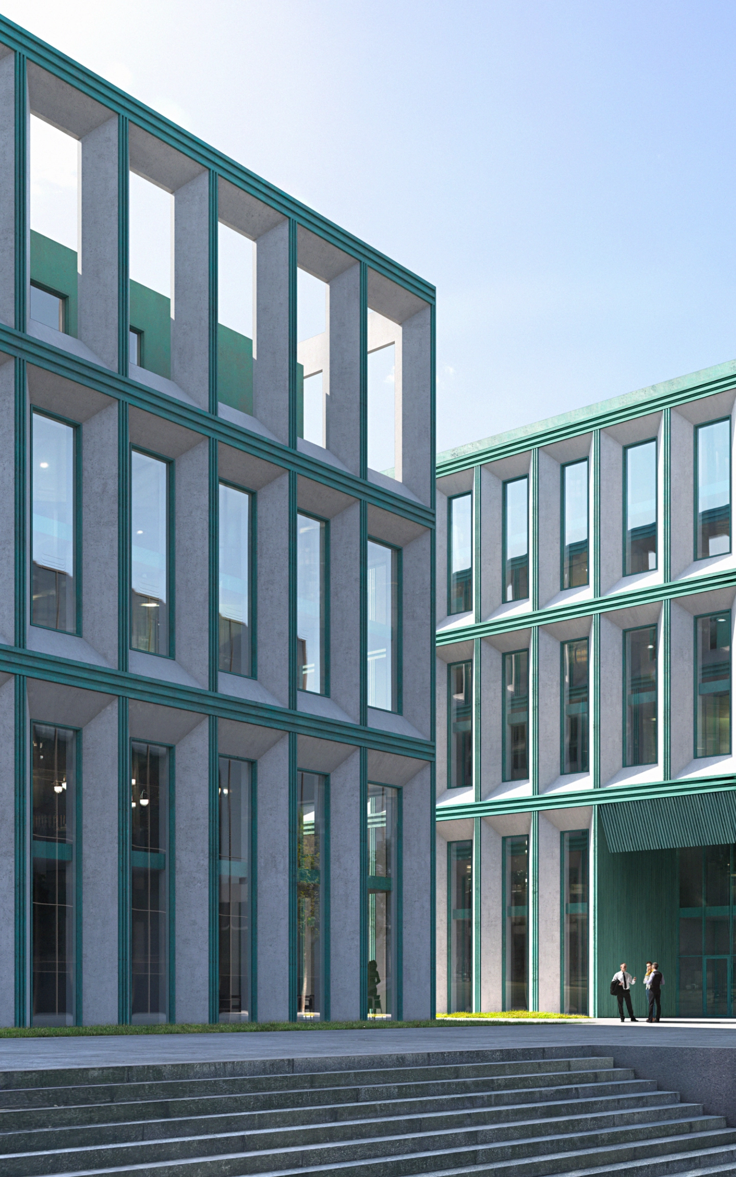 Stable, newly designed buildings gain dynamism on sunny days when the sun plays with their sculpture. They also present different faces depending on the perspective: in sharp focus, they are full and seemingly inaccessible, disciplined only by the drawing of the copper detail. In a broader context, they present their openness and transparency.