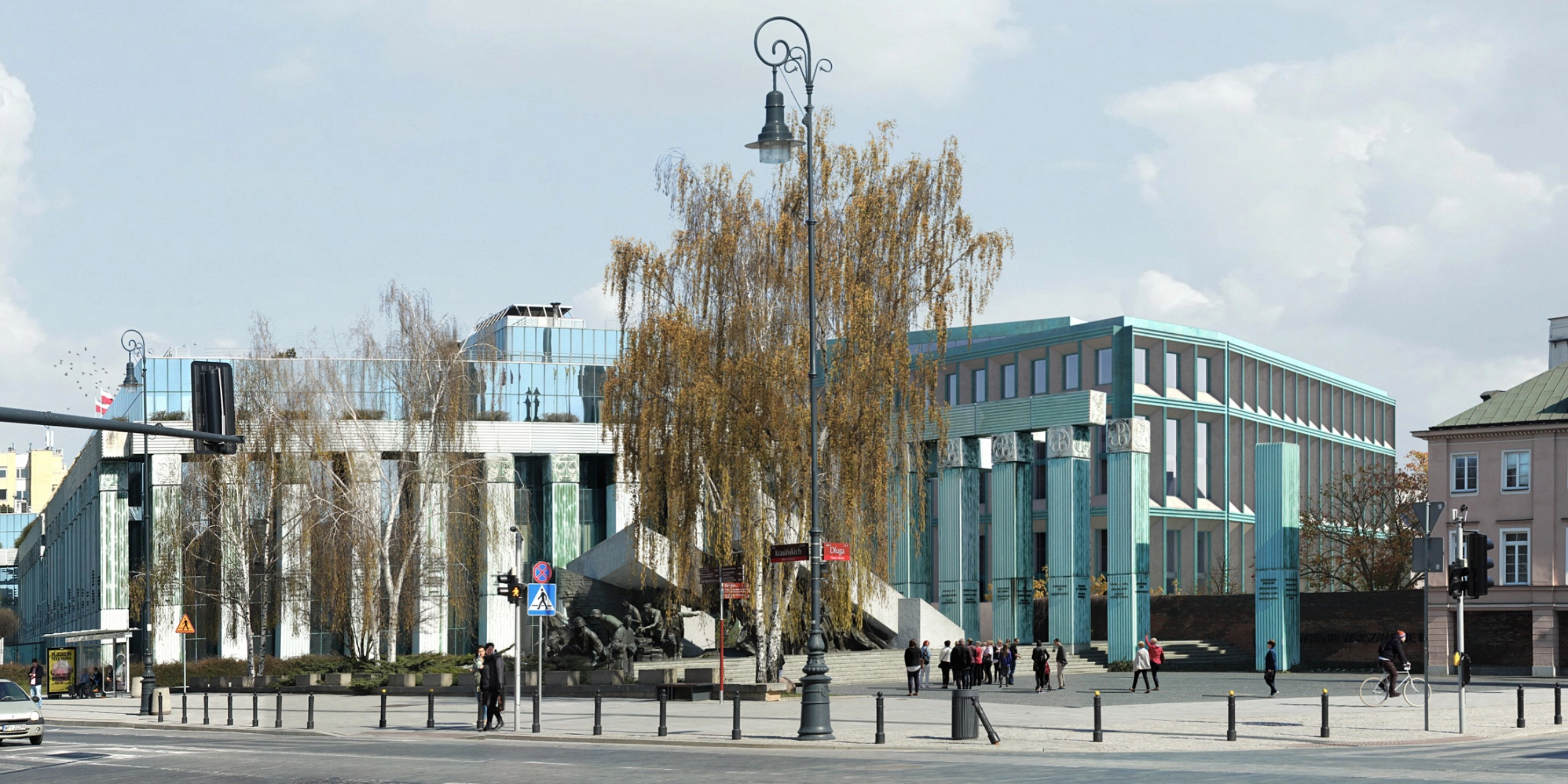 The quarter on Świętojerska Street, behind the Supreme Courts, is a unique place, both because of the tragic history of the Warsaw Ghetto and its vast, now forgotten potential. The institution's origins lie somewhere within it; Professor Budzyński never intended it to be a base, but rather an urban alley leading to the Warsaw Uprising Monument and the Field Cathedral of the Polish Army. Today, however, strollers only happen upon this extraordinary interior with its monumental colonnade.