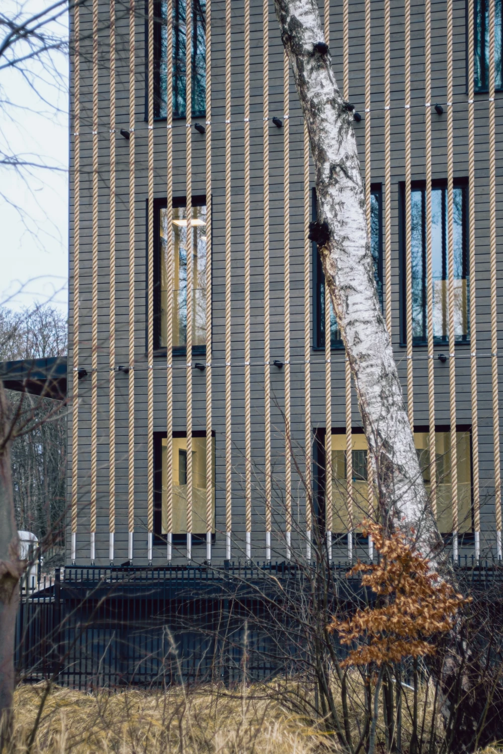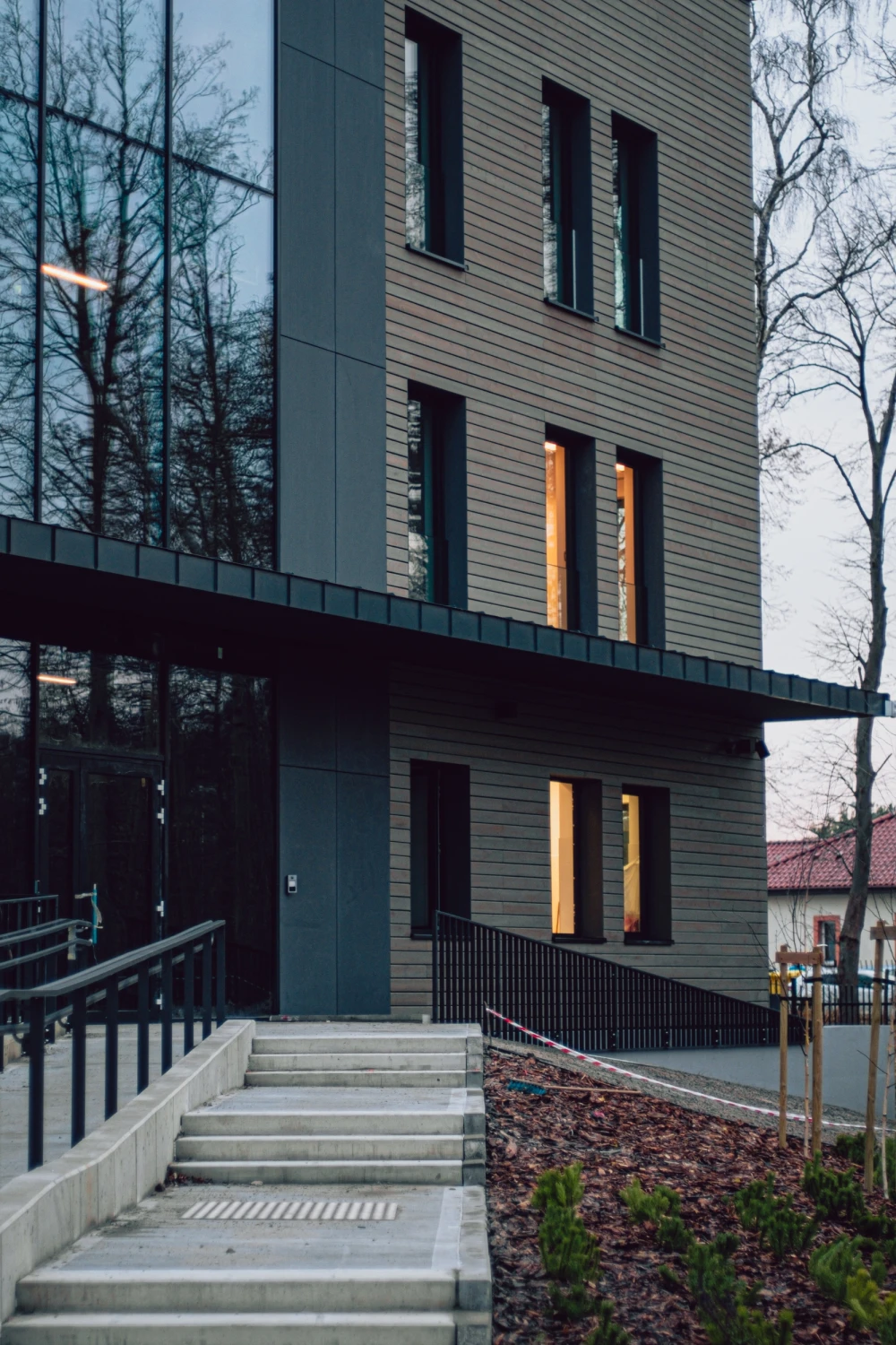 A key element of the concept is the front façade, modeled as a double-curved NURBS surface and clad in Siberian larch. Its geometric form was made possible by an innovative steel-and-wood substructure, which required every element to be individually adjusted. The 90-meter-long façade features a cantilever reaching up to 3 meters, while the carefully designed cladding maintains a consistent rhythm of rows despite the changing wall height, creating an effect of spatial permeability and natural rhythm that emphasizes the building’s connection with its surroundings.