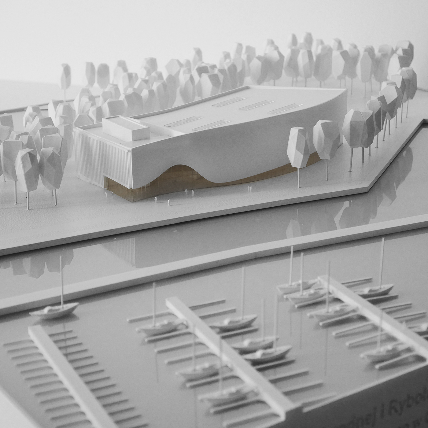 Our design envisions a compact, dynamic building form with a distinctive façade that, through its shape, refers to the surrounding coastal landscape: the current of the Łeba River, the movement of waves, the hull of a ship, and the characteristic dunes.