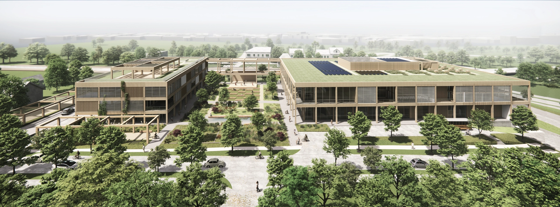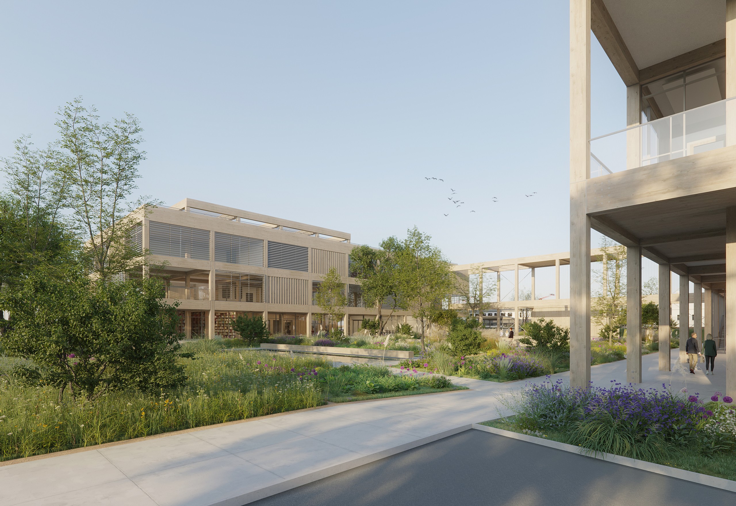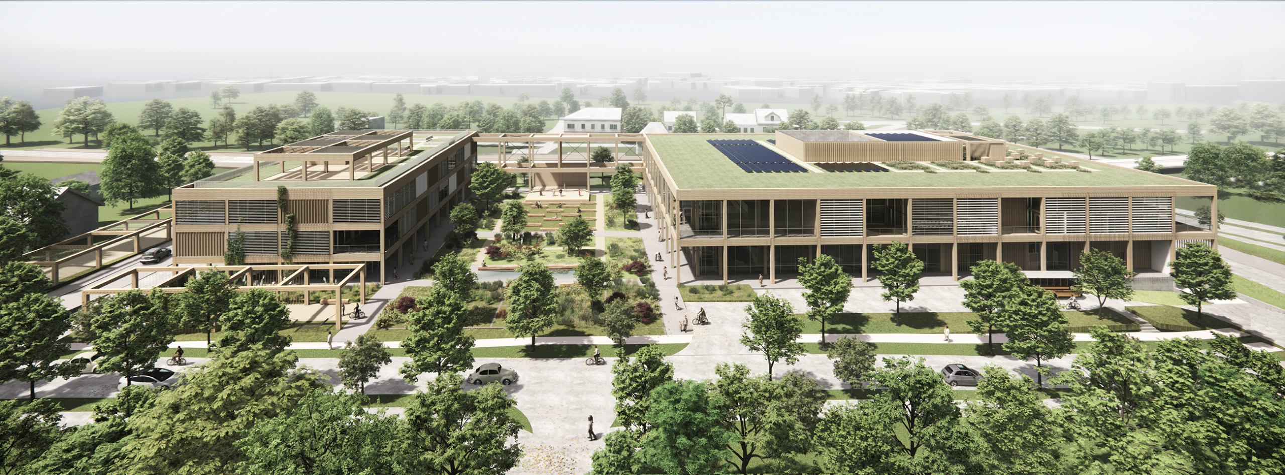 Zieleń i retencja są integralnymi elementami projektu. Dachy zaprojektowaliśmy jako zielone i dostępne dla użytkowników (Biblioteka) lub techniczne z panelami PV i przestrzenią dla uli (Teatr). Fasady porastają pnącza prowadzone po stalowej siatce, a większość nawierzchni na terenie to powierzchnie biologicznie czynne.