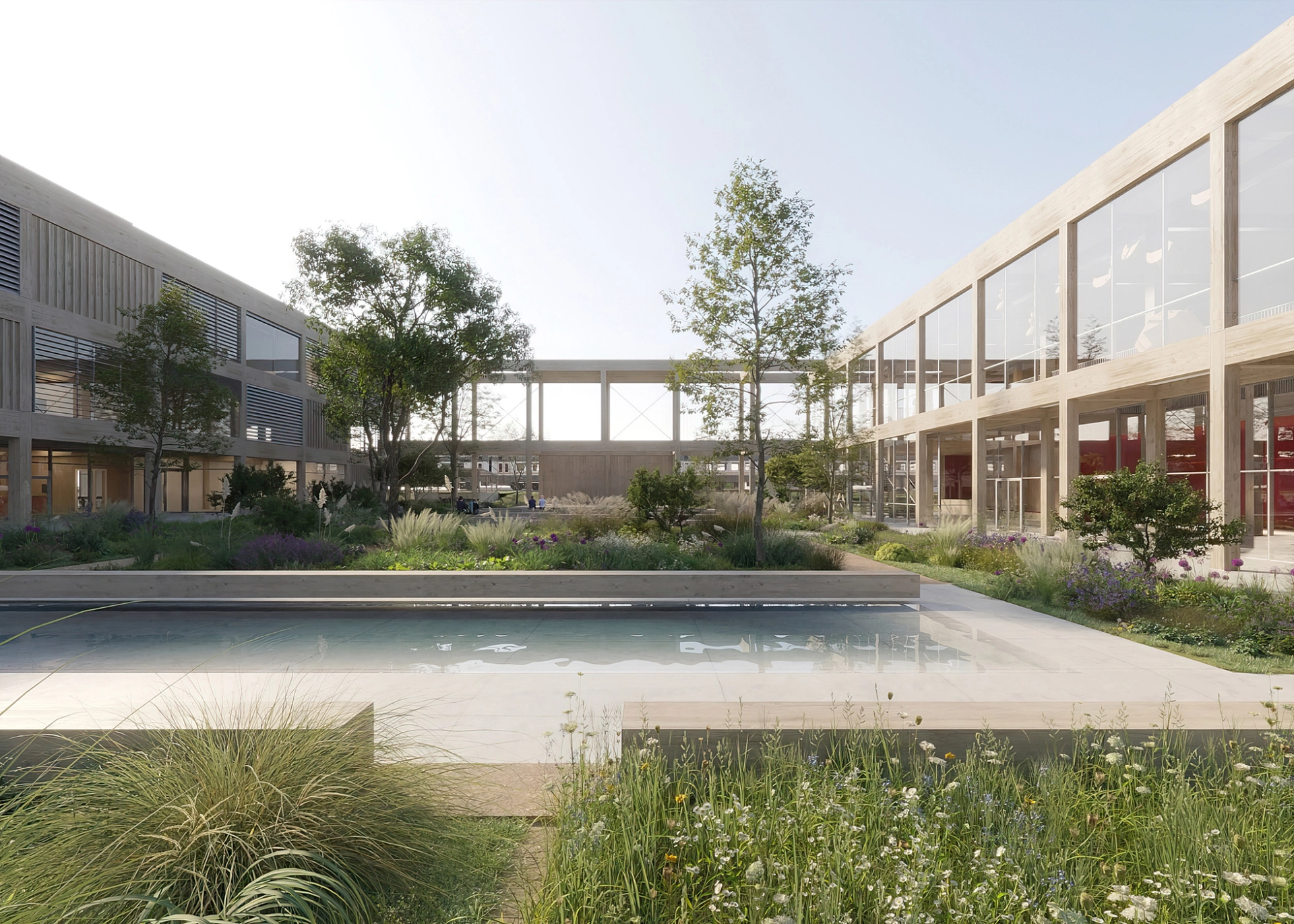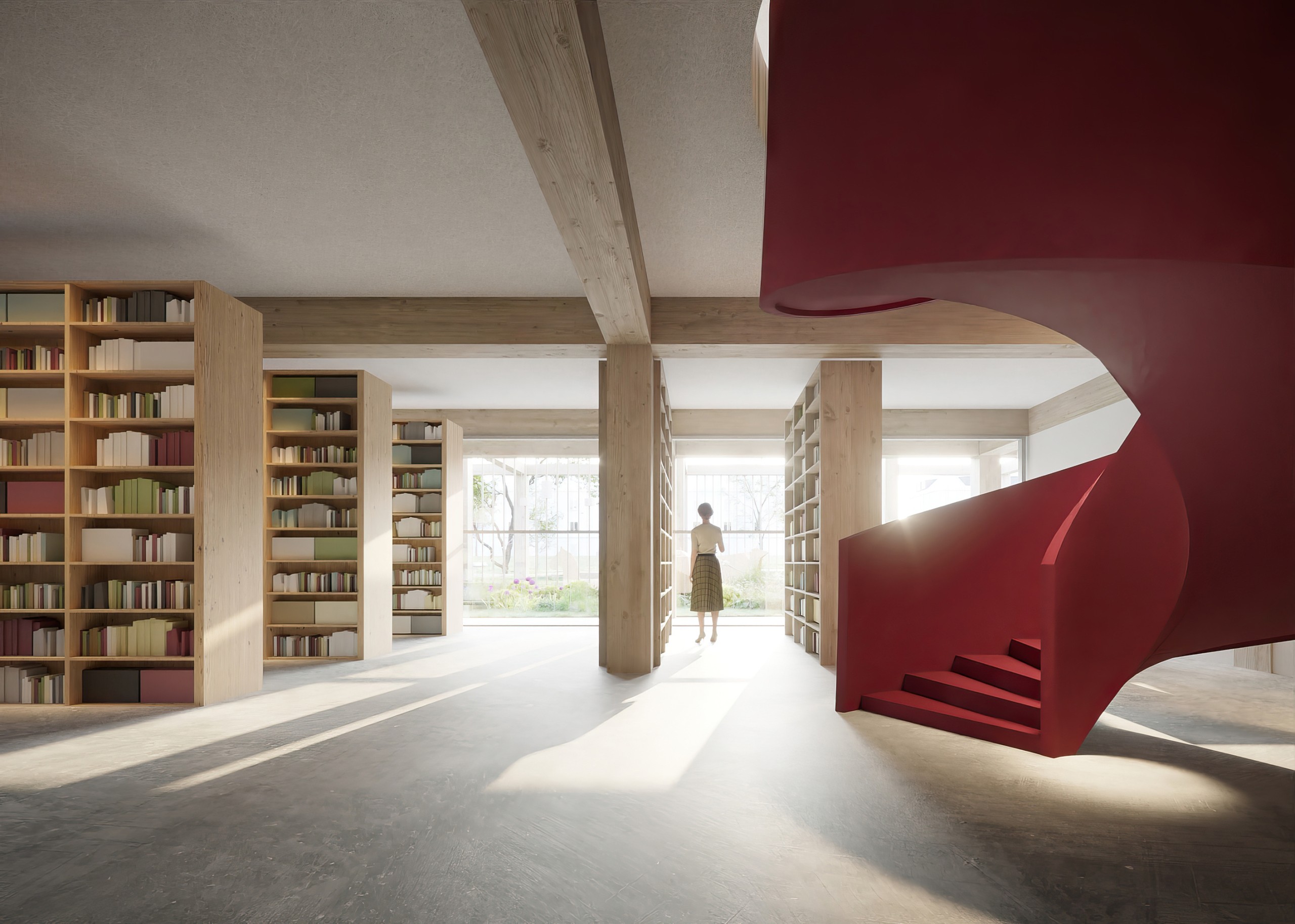 Całe założenie zorganizowaliśmy wokół zasad zrównoważonego budownictwa. Obie bryły wznoszą się na wspólnej kondygnacji podziemnej z betonu, natomiast nadziemne kondygnacje wykonane są z drewna klejonego. Taki wybór pozwala znacząco zredukować ślad węglowy inwestycji, skrócić czas realizacji dzięki prefabrykacji oraz stworzyć przestrzenie o przyjaznym, naturalnym charakterze. Widoczna struktura drewna organizuje przestrzenie foyer i biblioteki, zapewniając ich jednoczesną monumentalność i ciepło.