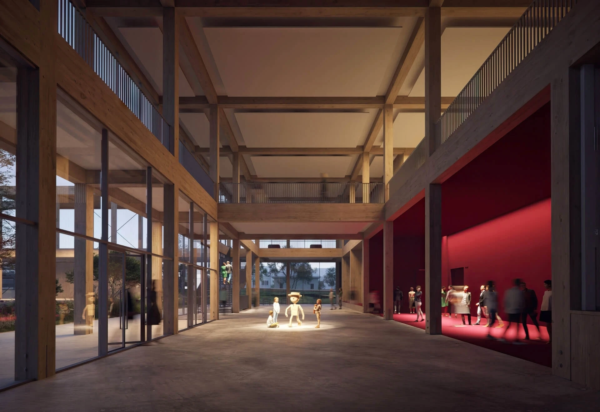 W naszej koncepcji zespół tworzą dwa osobne budynki - Teatru i Biblioteki - powiązane przestrzennie i formalnie poprzez wspólny moduł konstrukcyjny, oparty na drewnianej strukturze o siatce 6×6 m. To właśnie ona organizuje rytm całego założenia - od układu elewacji, przez wnętrza, aż po elementy małej architektury. Drewniana kratownica definiuje też estetykę - elewacje składają się z mozaiki przeszkleń, loggii, pełnych ścian i ruchomych żaluzji, które tworzą dynamiczny, ale harmonijny obraz.