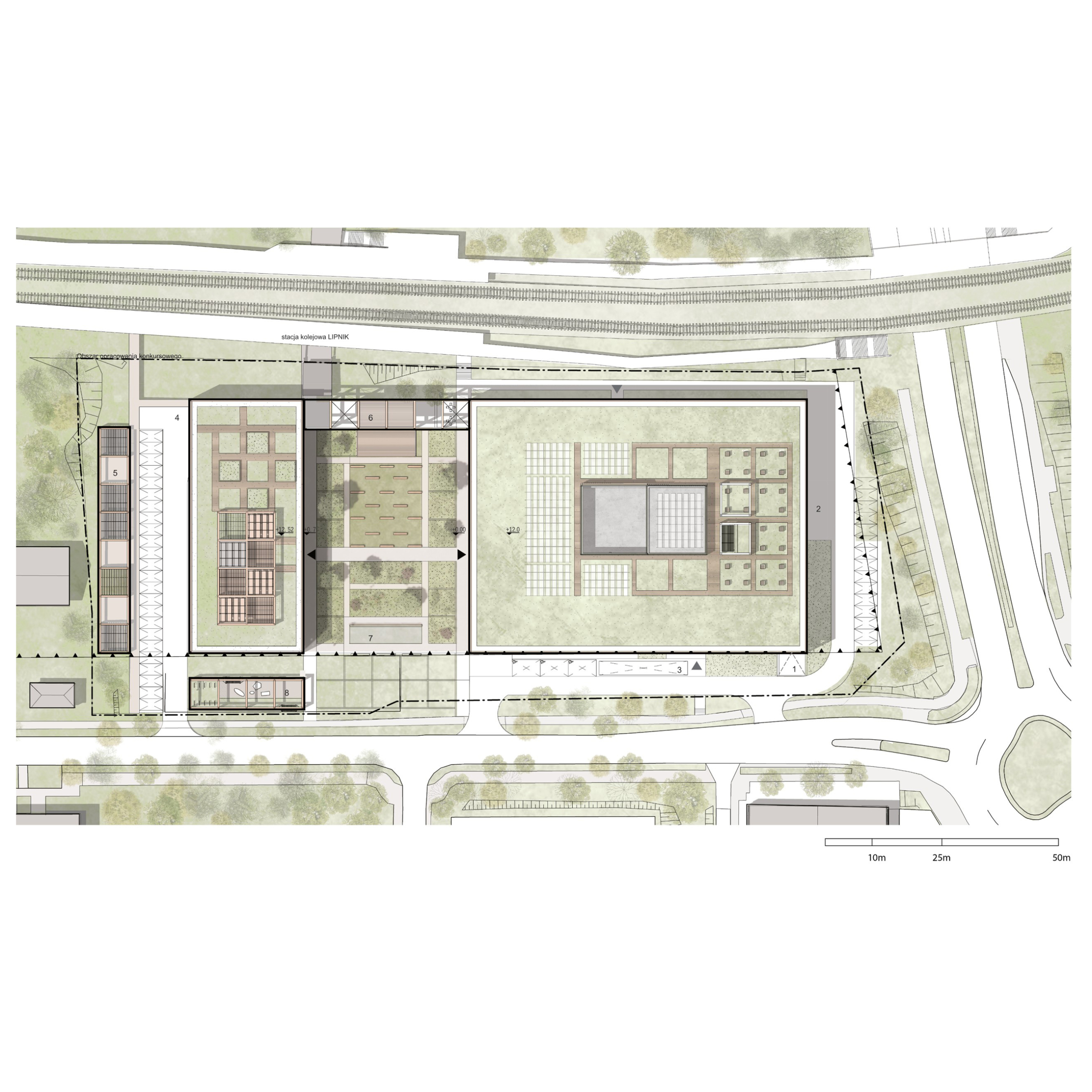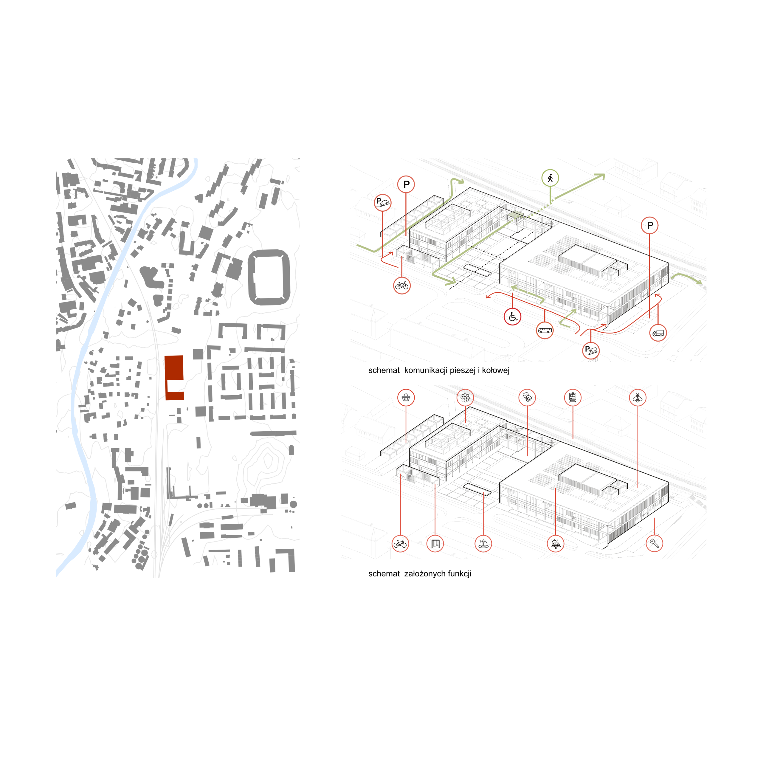 Na działce przewidzieliśmy też funkcje komplementarne: miejsca postojowe dla rowerów, zatoki autobusowe, strefy dostaw i parking podziemny bezpośrednio pod budynkami. Od strony południowej jest przestrzeń na cotygodniowe targowisko. W północnej części działki znalazła się strefa obsługi technicznej oraz miejsca dla osób z niepełnosprawnościami.