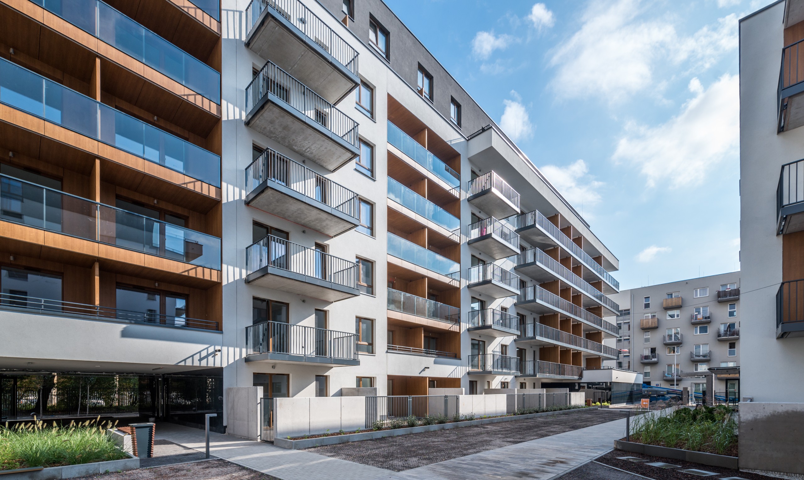 Elewacje zaprojektowaliśmy z prawdziwej cegły, okładzin w kolorze teaku oraz tynku, co nadaje budynkom ponadczasowy, estetyczny charakter. Budynki otaczają wewnętrzny dziedziniec, który stał się sercem osiedla - znajduje się tu nowoczesny plac zabaw z niestandardowym wyposażeniem oraz zielona strefa wypoczynku z elementami donic, ławek i wygrodzeń wykonanych z estetycznego betonu architektonicznego.