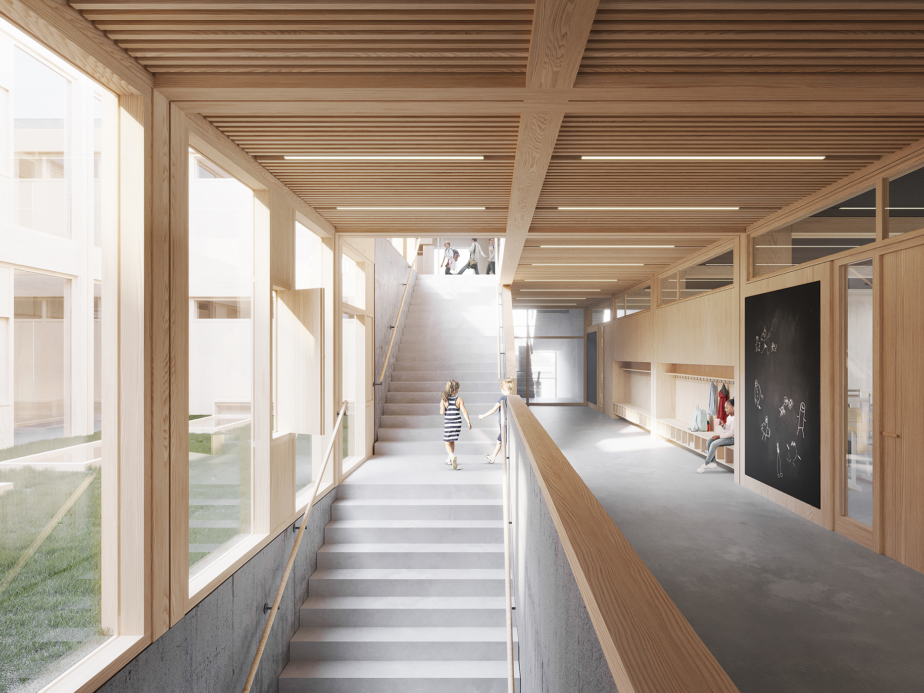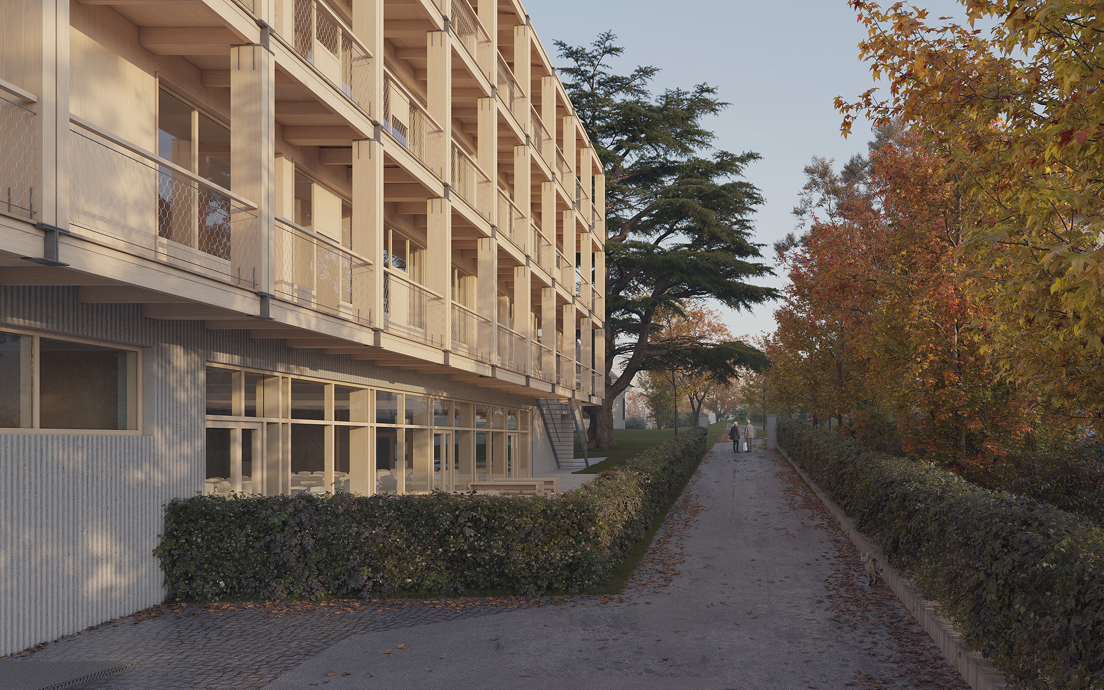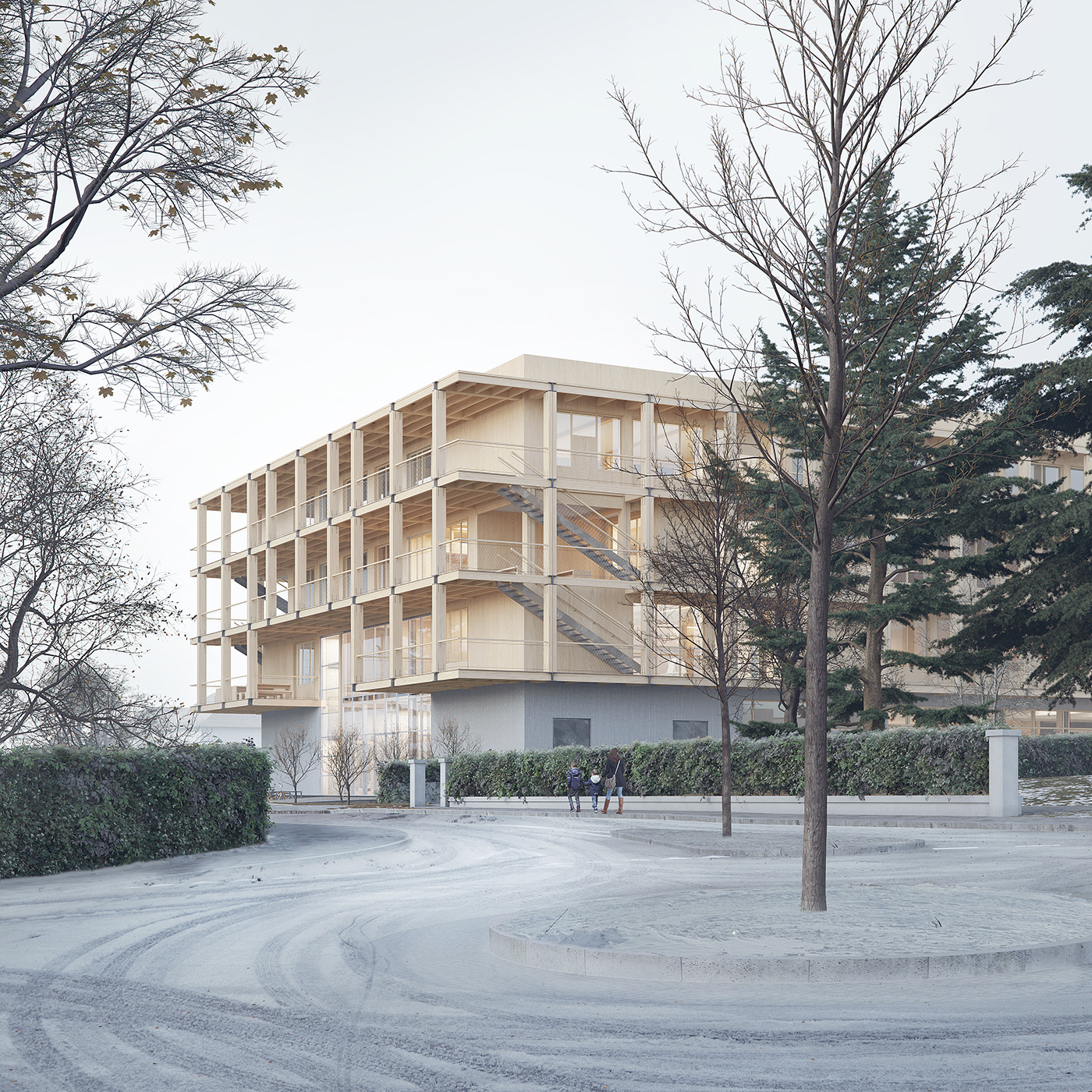 Pozostała część terenu jest wydzielona i stanowi bezpieczną oazę dziecięcych gier i zabaw na świeżym powietrzu. Ponieważ w zabytkowych willach będą odbywać się zajęcia pozaszkolne (parascolaire) oraz zostaną one udostępnione mieszkańcom dzielnicy, dlatego do starego ogrodu, przewidziano dodatkowe wejścia: od strony południowo-zachodniej i wschodniej (poprzez służebność). Zielony teren, w którym królują dwa ogromne cedry jest ściśle powiązany nie tylko z XIX-wieczną zabudową, ale przede wszystkim tworzy liczne synergie z nowym budynkiem. Z każdego poziomu okalających bryłę balkonów można dostać się bezpośrednio do szkolnego parku zbiegając po zewnętrznych schodach.