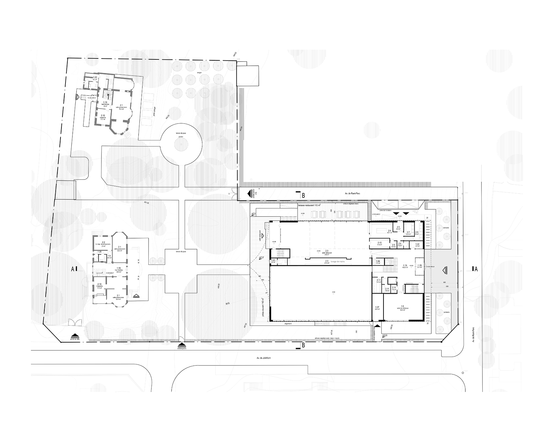 Umieszczona na parterze wielofunkcyjna stołówka - serce codziennego życia szkolnego, otwiera się na przestrzeń ogrodu dzięki zadaszonym tarasom, które w letnie dni będą tętniły życiem. Pomiędzy willą Joli-Mont, a nowo-projektowanym budynkiem przewidziano symetrycznie usytuowany, obsadzony rajskimi jabłoniami, placyk do gier i zabaw. System prostych ścieżek, rozmieszczonych osiowo względem willi podkreśla powiązanie urbanistyczne pomiędzy starym i nowym. Dopełnieniem tego dialogu jest obszerny préau, którego dach zawadiacko unosi się w kierunku willi, machając jej spomiędzy cedrowych, ciężkich gałęzi. Przed willą Riant-Parc, w nasłonecznionej części ogrodu wygospodarowano okrągły plac zabaw, pośrodku którego zasadzono gruszę. Za kilka, kilkanaście lat jej owoce będą stanowiły słodki przysmak dla uczniów i innych korzystających z tego ogrodu. Nie będą to jedyne owoce, które dojrzeją w szkolnym sadzie. W południowo-wschodnim, nasłonecznionym, narożniku działki Riant-Parc posadzono kilka moreli i śliw. Poza tym w ogrodzie wygospodarowano miejsce na kilka grządek wykorzystywanych w celach edukacyjnych, a pachnącymi ziołami uzupełniono niemal każdy skąpany w słońcu fragment zieleni.