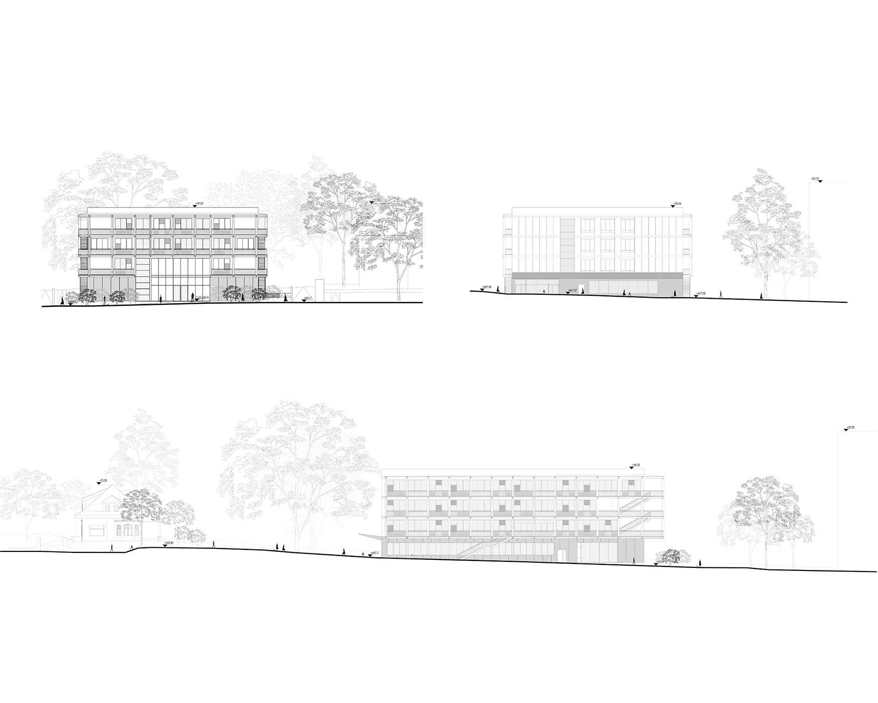 Na działce trwa nieustanna zabawa światła i cienia. Słońce co i rusz wkrada się pomiędzy XIX-wille, aby za chwilę przegrać z rozłożystymi koronami starych drzew. Najwięcej swobody gorące światło ma w części południowej działki, gdzie niegdyś był sad, a dziś stanął nowy budynek.