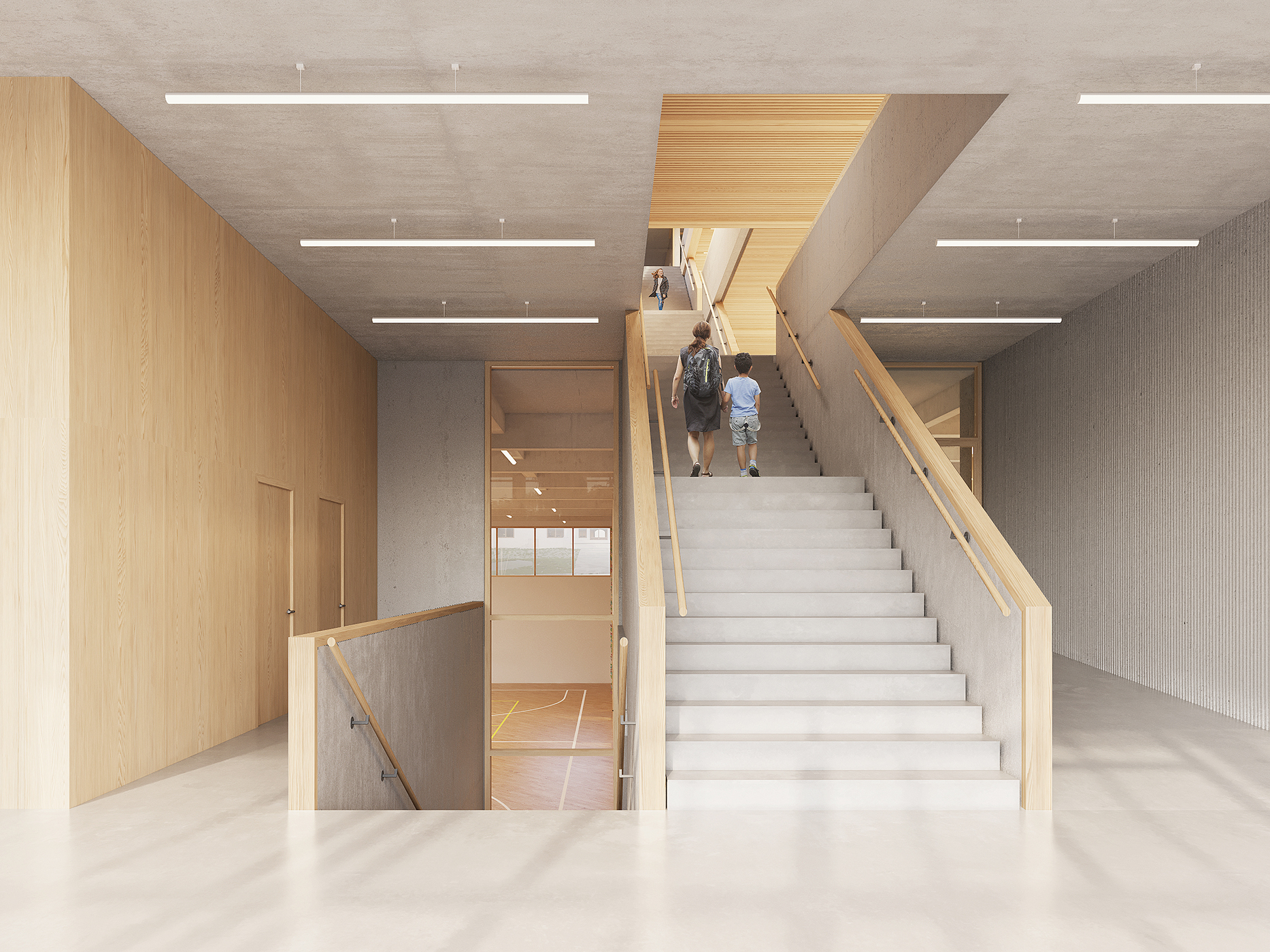 Jednak nowy obiekt nie poddaje się szantażowi natrętnych promieni. Niczym drzewa swe gałęzie, rozpościera on wokół fasad system kładek, schodów, tarasów i głębokich loggi, które oprócz funkcji zakrytego dziedzińca szkolnego (préau) stanowią doskonałą ochronę przed przegrzewaniem się elewacji i wnętrz, niezależnie od faktu, iż okna wyposażono w zewnętrzne rolety przeciwsłoneczne.