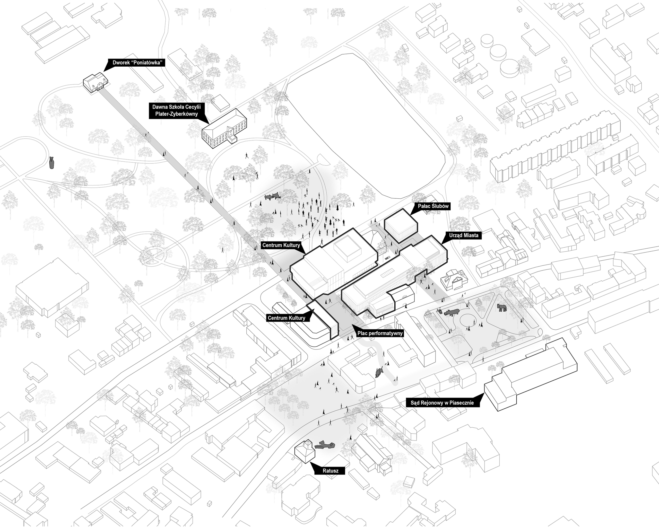 Magia miasta polega na połączeniu chaosu i harmonii, zgiełku i ciszy, przeszłości i przyszłości. Eksplorowanie wielowątkowej materii tworzącej aktualny obraz centrum Piaseczna i uważna analiza mapy ulubionych ścieżek mieszkańców, to prolog do projektowej opowieści, która poszukuje balansu pomiędzy urbanizacją, naturą i oczekiwaniami lokalnej społeczności.