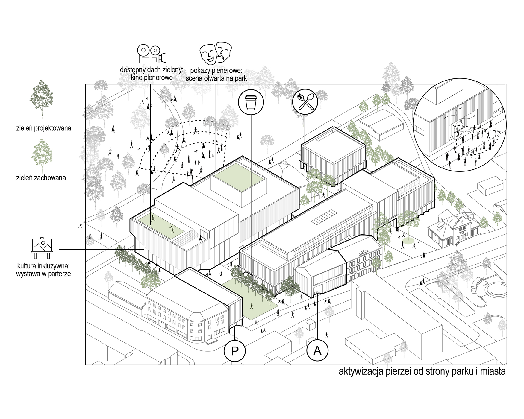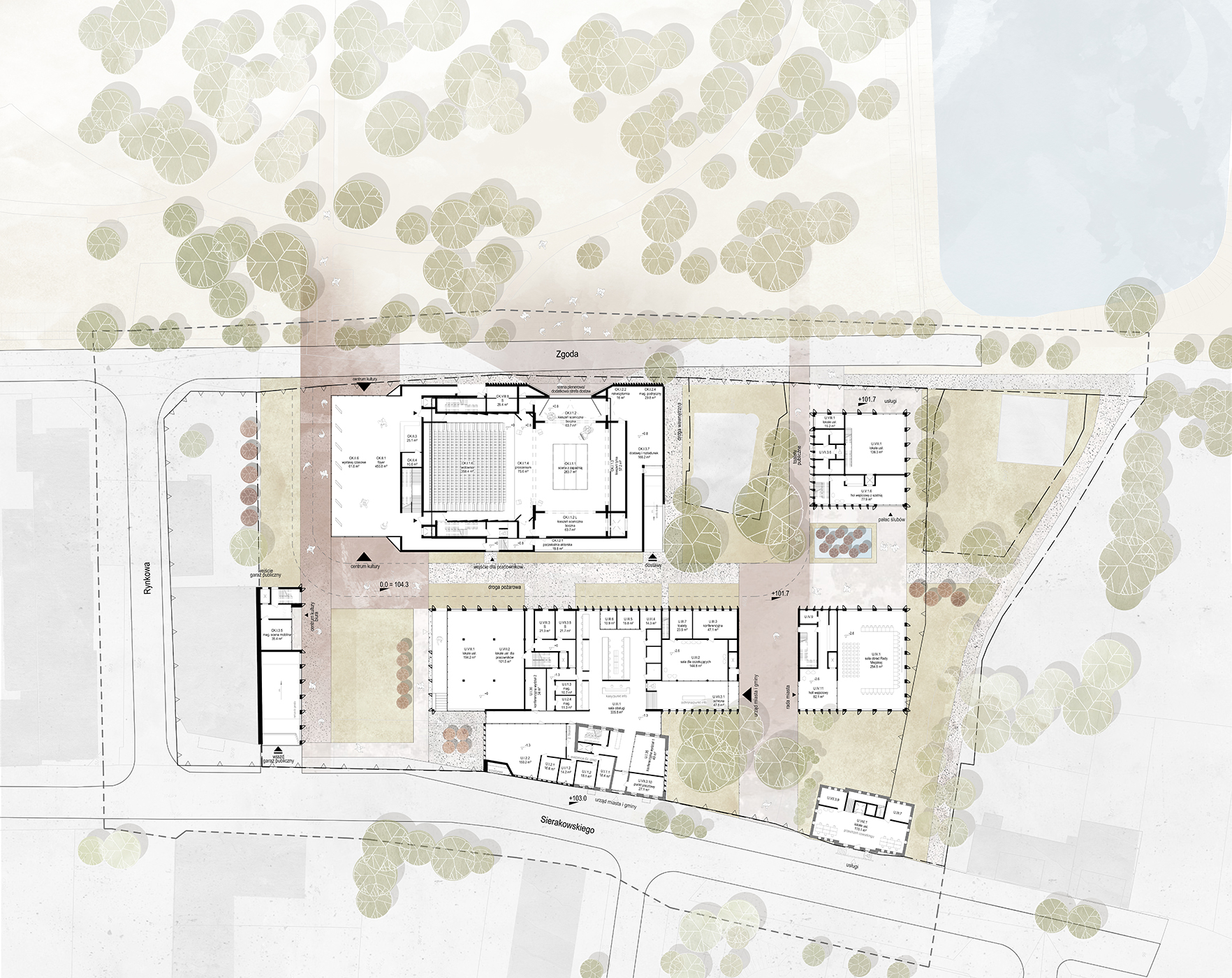 Projekt opiera się na przejrzystej siatce placów, ścieżek i pasm zieleni – odpowiadającej rytmowi miasta. Zachowane zostały ważne osie widokowe i społeczne relacje z otoczeniem. Wrota to nie tylko budynki – to sekwencja otwartych przestrzeni, zachęcających do aktywności, spotkań i udziału w kulturze.
