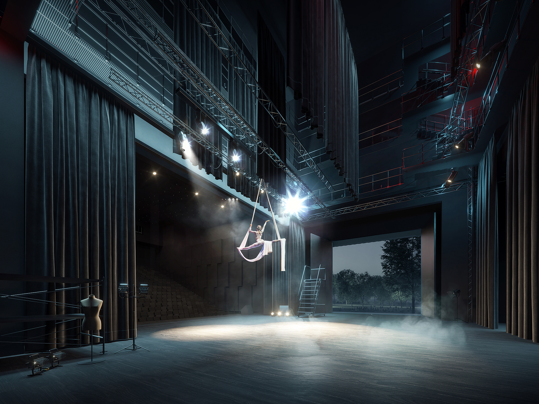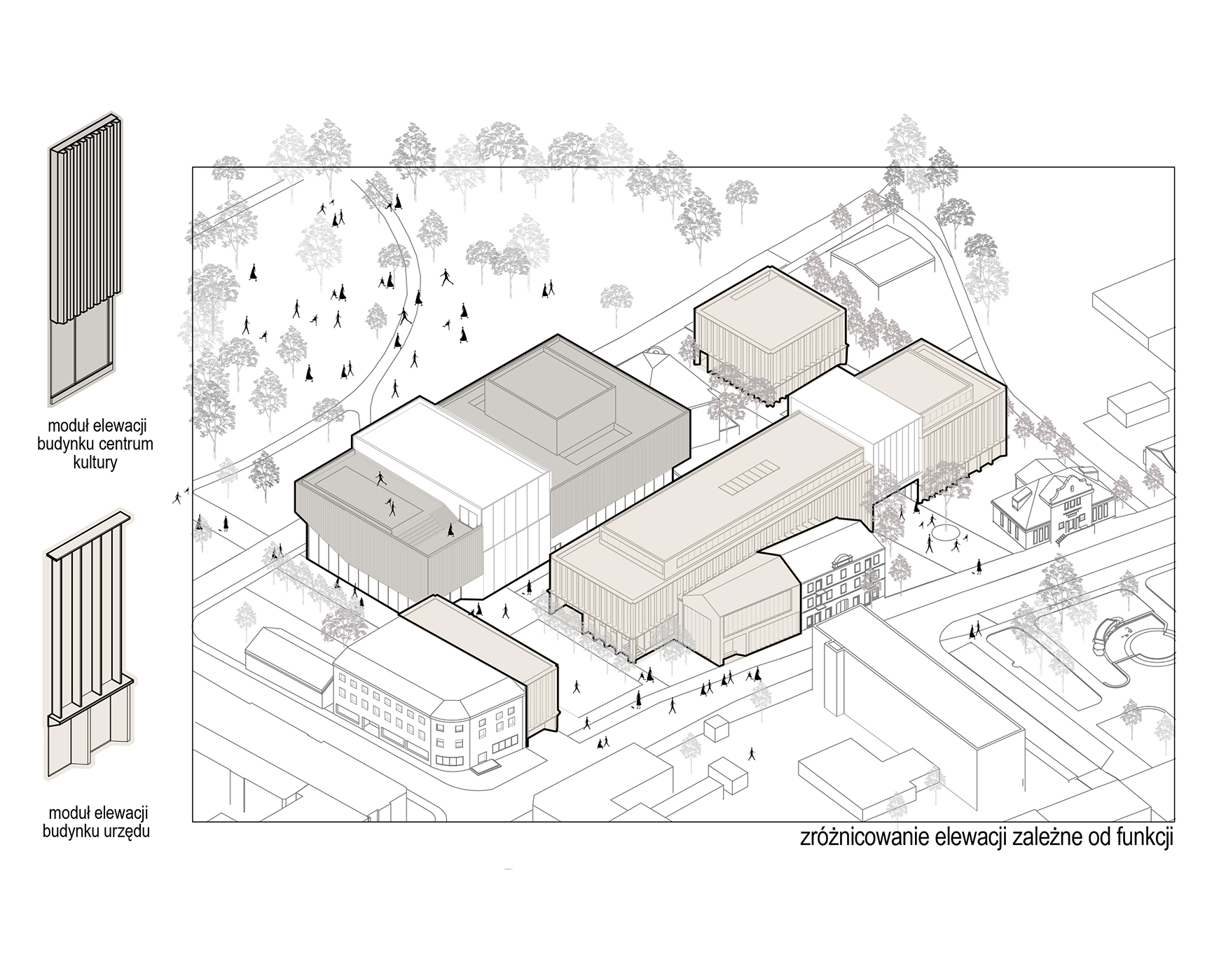 Centrum Kultury staje się żywą sceną – z otwieranym „Oknem Kultury”, które łączy wnętrze z parkiem. Elewacje z prefabrykatów i szklenia budują dramaturgię: od transparentności po monumentalność. Nawet techniczne zaplecze zostało potraktowane z równą starannością – bo tu każdy element pracuje na jakość wydarzenia.