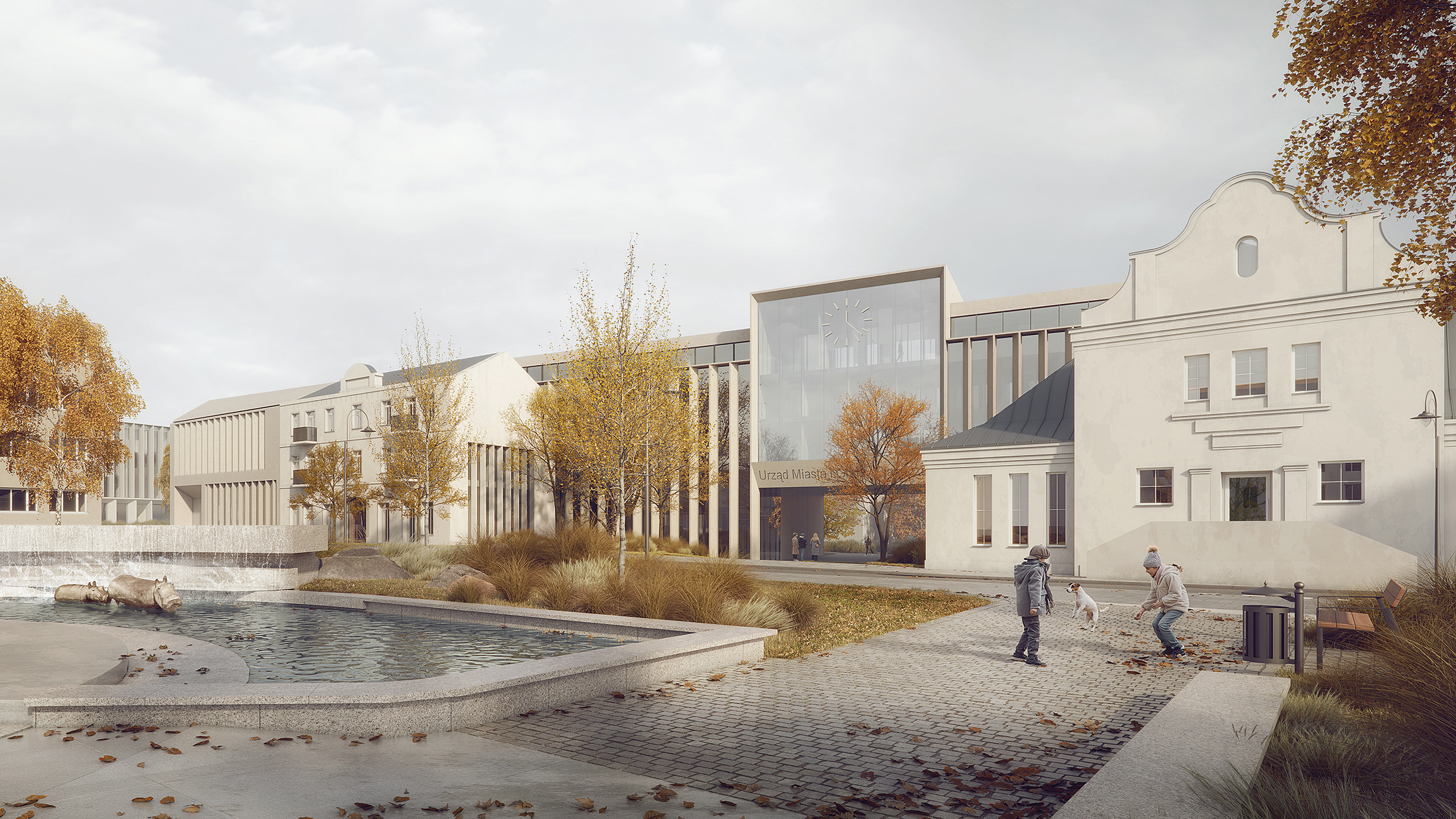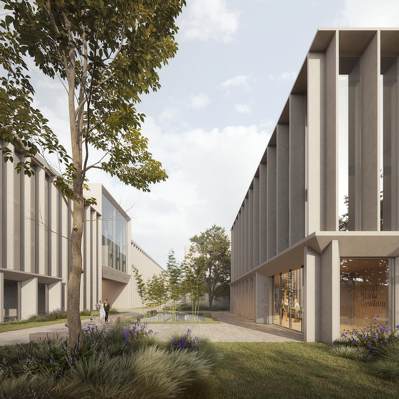 Budynki urzędu i przestrzenie usługowe pod arkadami tworzą nową jakość codzienności – miejsca spotkań, pracy i relaksu. Dzięki spójnym materiałom i detalowi, cały kompleks działa jak przemyślana, miejska całość.