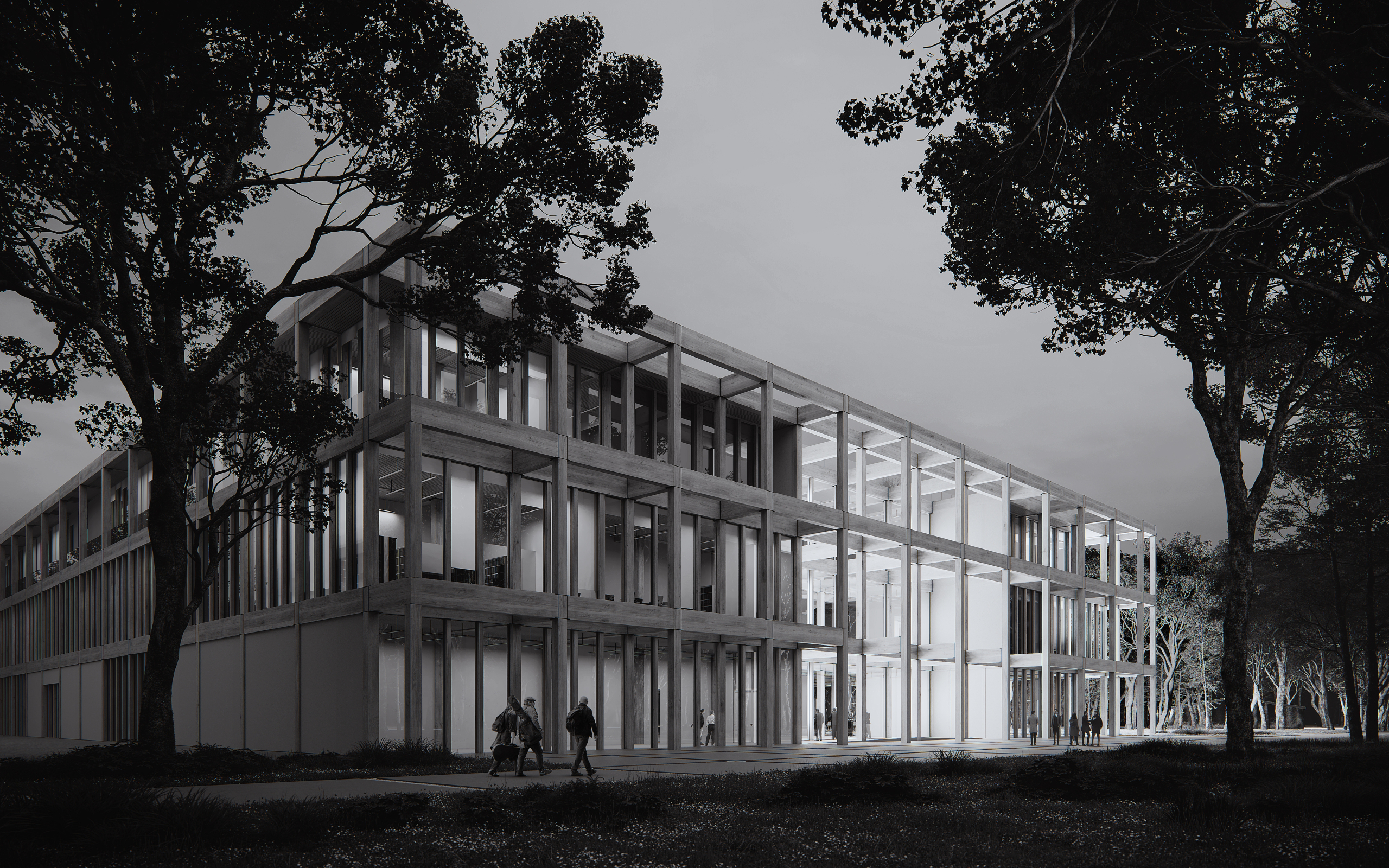 Swą dyskretną obecnością udowadnia, że miasto może scalić się z naturą w sposób modelowy, bez zgrzytów, miękko i z szacunkiem. Dlatego też nowa siedziba Akademii ma tylko 3 kondygnacje wysokości. Większość drzew jest od niej wyższa, a wszelkie kadry, czy otwarcia zawsze odnajdują ludzką skalę. Modularna struktura budynku jest ażurowa, nie zamyka się, wręcz przeciwnie meandruje pomiędzy drzewami otaczając szeroką, otwartą przestrzenią dwa pomniki przyrody.