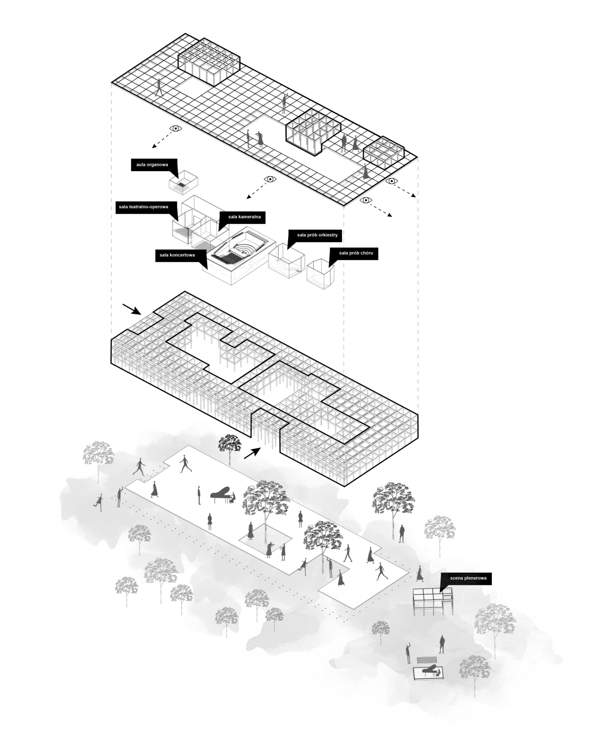 Nowa lokalizacja Akademii Muzycznej im. Krzysztofa Pendereckiego narzuca podobny tok myślenia, jak przy projekcie pawilonu i nie pozwala zignorować otoczenia Parku Grzegórzeckiego, pomników przyrody, sąsiedztwa Wisły i Bulwaru Kurlandzkiego, czy wreszcie, potencjału ekologicznego miejsca. Zdegradowana jeszcze przestrzeń dawnych koszarów, już dziś szumi opowieść o pięknym angielskim ogrodzie, ze starodrzewiem i nietuzinkowym obiektem Akademii, który z poszanowaniem wpisze się pomiędzy stare pnie i korony, tworząc przestrzeń dla uczelnianego życia i natury.