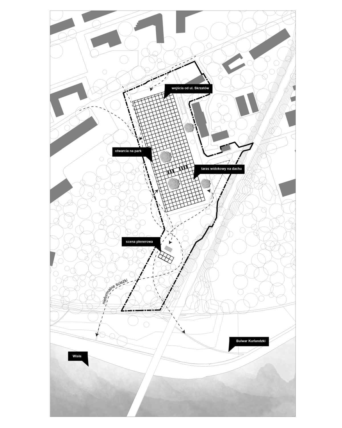 Na przekór pierwszym pomysłom, projekt ten nie próbuje nawiązać do historycznej zabudowy Krakowa (choć pewne paralele w nim się pojawiają), czy ikonicznej sylwety starego grodu majaczącej gdzieś w widokach północno-zachodnich. Idea całego założenia osadzona jest po prostu w… parku. W tym właśnie, lokalnym, jeszcze zaniedbanym parku, choć czysto teoretycznie, budynek mógłby powstać w dowolnym założeniu ogrodowym i zapewne jego zdyscyplinowana struktura elastycznie dopasowałaby się do dowolnej lokalizacji. W pewnym sensie, pod względem kontekstu, obiekt jest wręcz introwertyczny. Harmonizuje się z najbliższym otoczeniem, nie szuka odpowiedzi na pobliski urbanistyczny ład lub jego brak. Po prostu zatapia się w zielonej, miejskiej oazie w pobliżu Wisły.