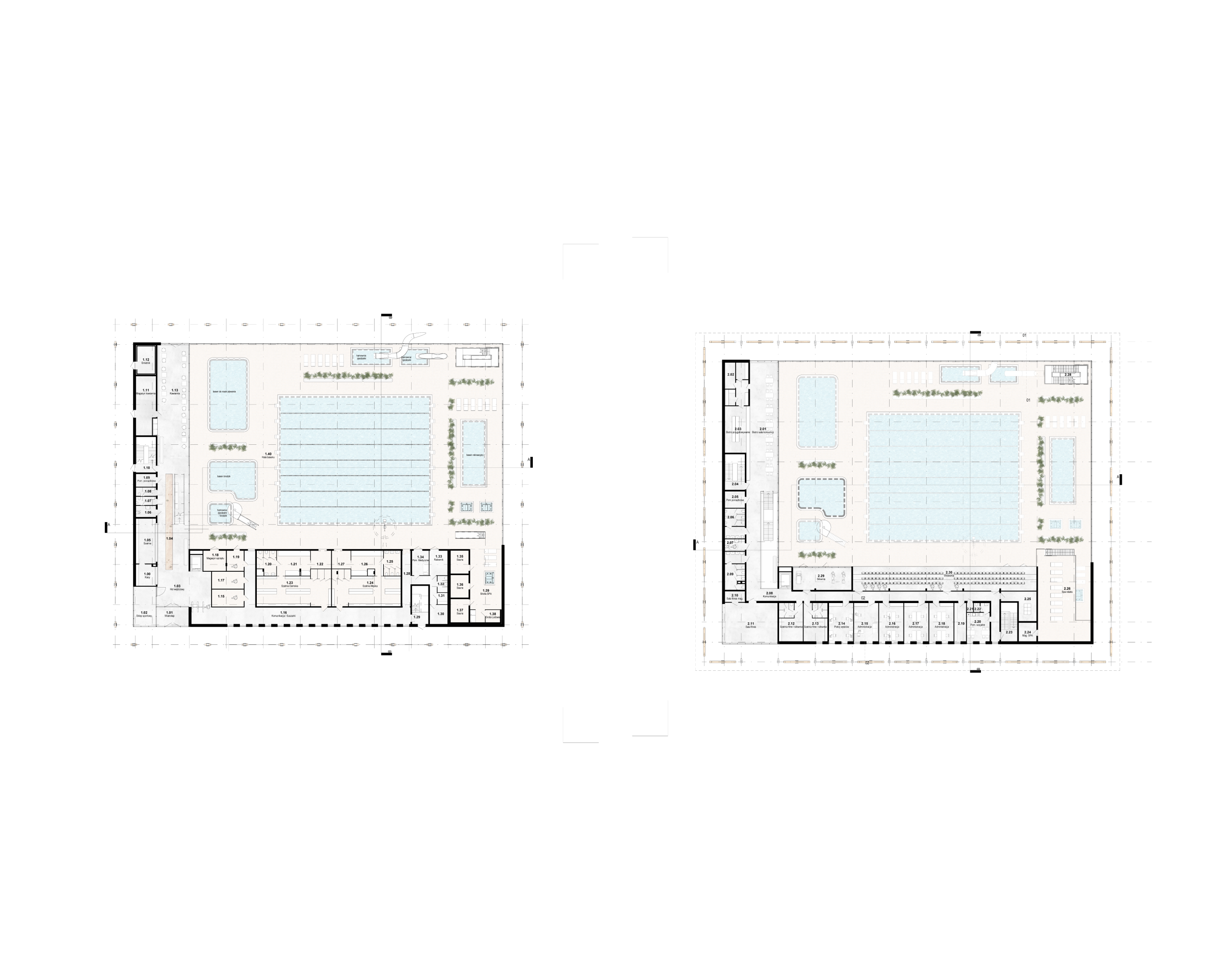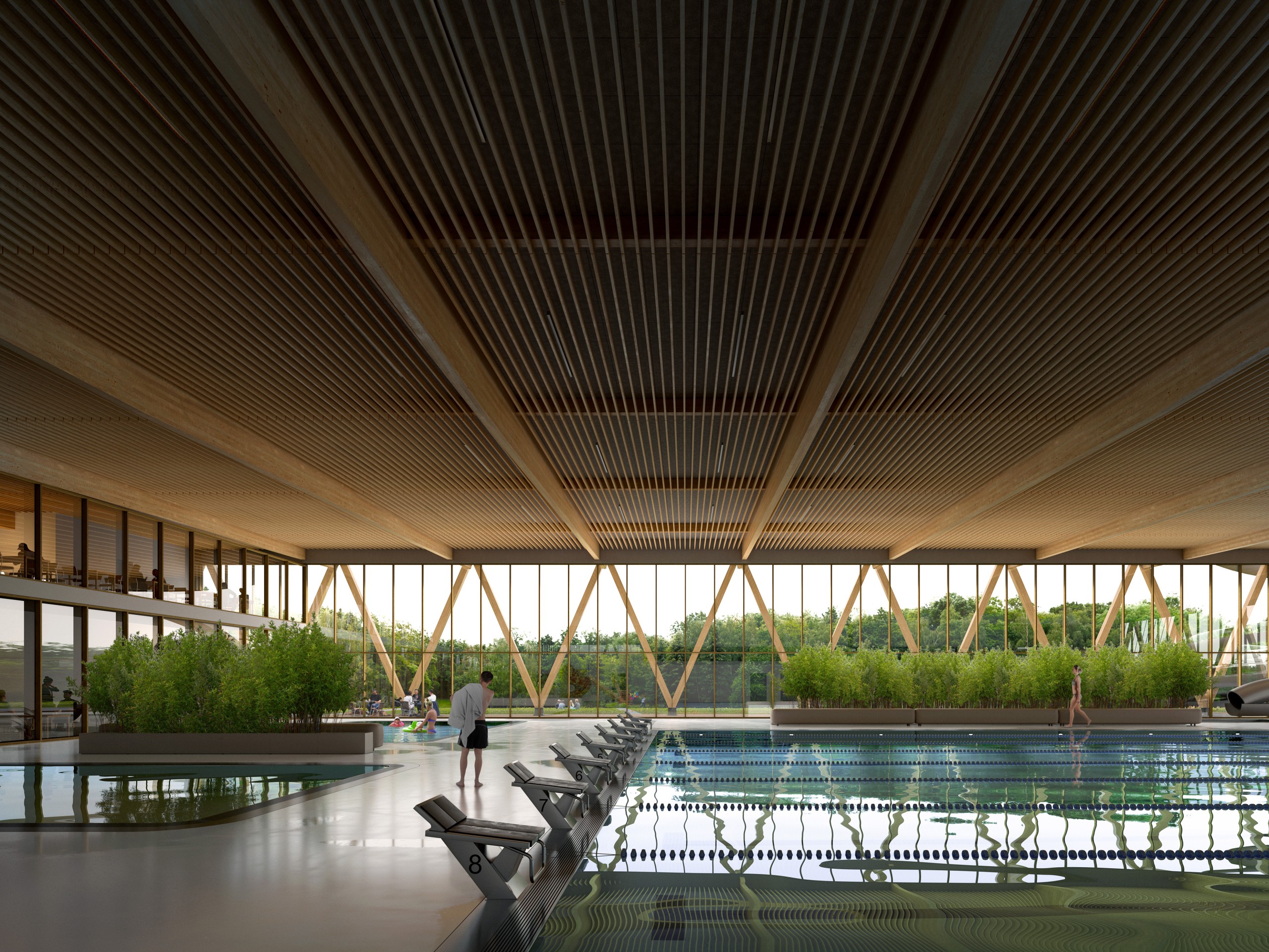Projekt pływalni na Białołęce zakłada stworzenie nie tylko obiektu sportowego, lecz przede wszystkim otwartej, społecznej przestrzeni – „sąsiedzkiego podcienia” łączącego funkcję rekreacyjną, edukacyjną i integracyjną. Drewniana konstrukcja budynku otoczona jest ogólnodostępnym podcieniem, który stanowi zadaszoną strefę spotkań, warsztatów i lokalnych wydarzeń, płynnie łącząc się z romantycznym parkiem pełnym łąk, drzew i naturalnego cieku wodnego.