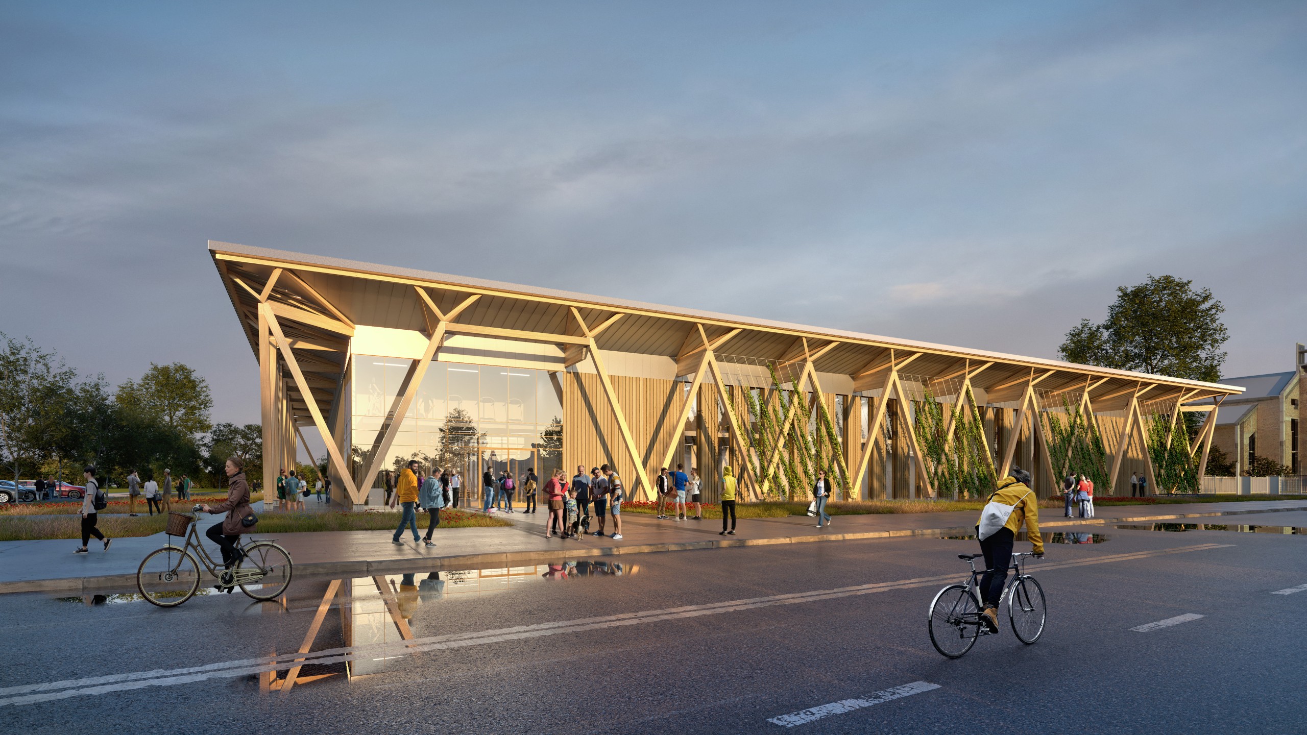 Układ przestrzenny podporządkowano prostocie i przejrzystości, z maksymalnym zachowaniem terenów zielonych i otwarciem widokowym na północ. Całość dopełnia ekologiczna konstrukcja z prefabrykowanego drewna o niskim śladzie węglowym, pozwalająca na szybki montaż i ewentualne etapowanie budowy. Powstał w ten sposób projekt nowoczesnego, inkluzywnego miejsca spotkań, w którym architektura harmonijnie przenika się z naturą i lokalną wspólnotą.