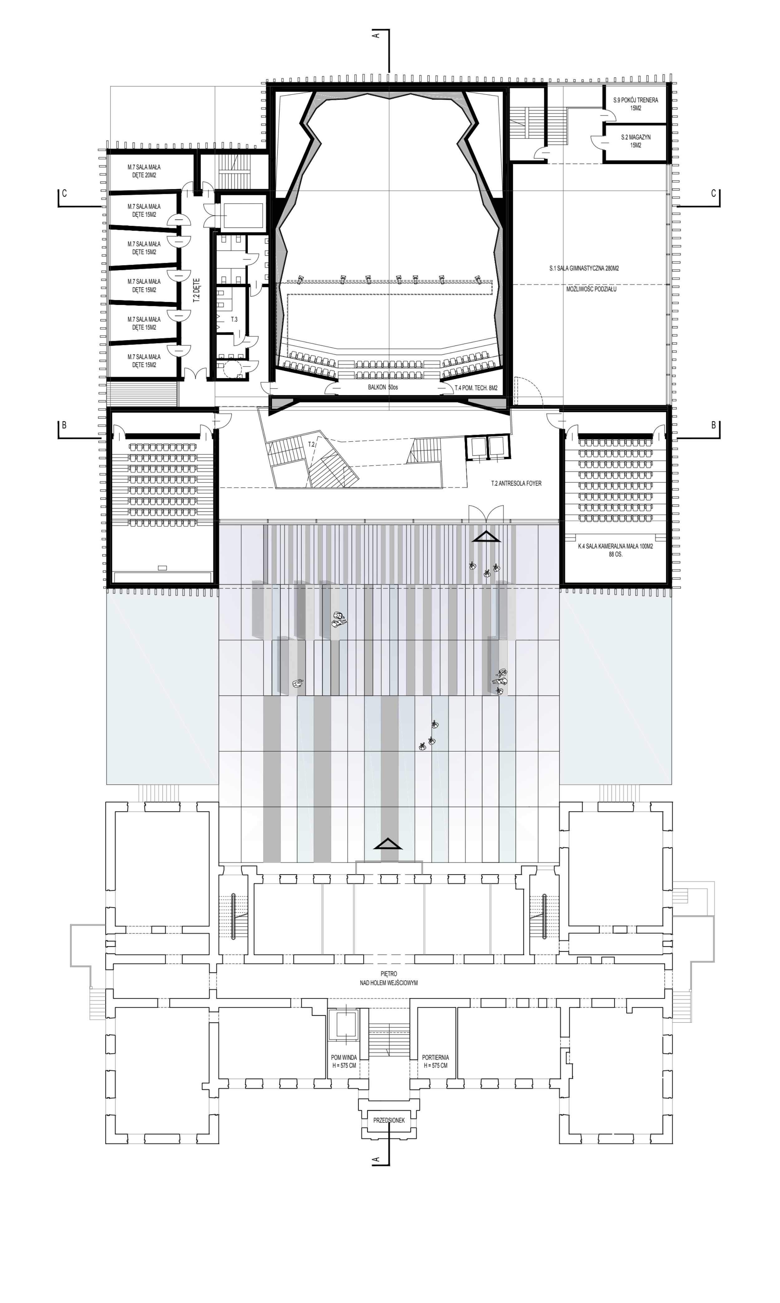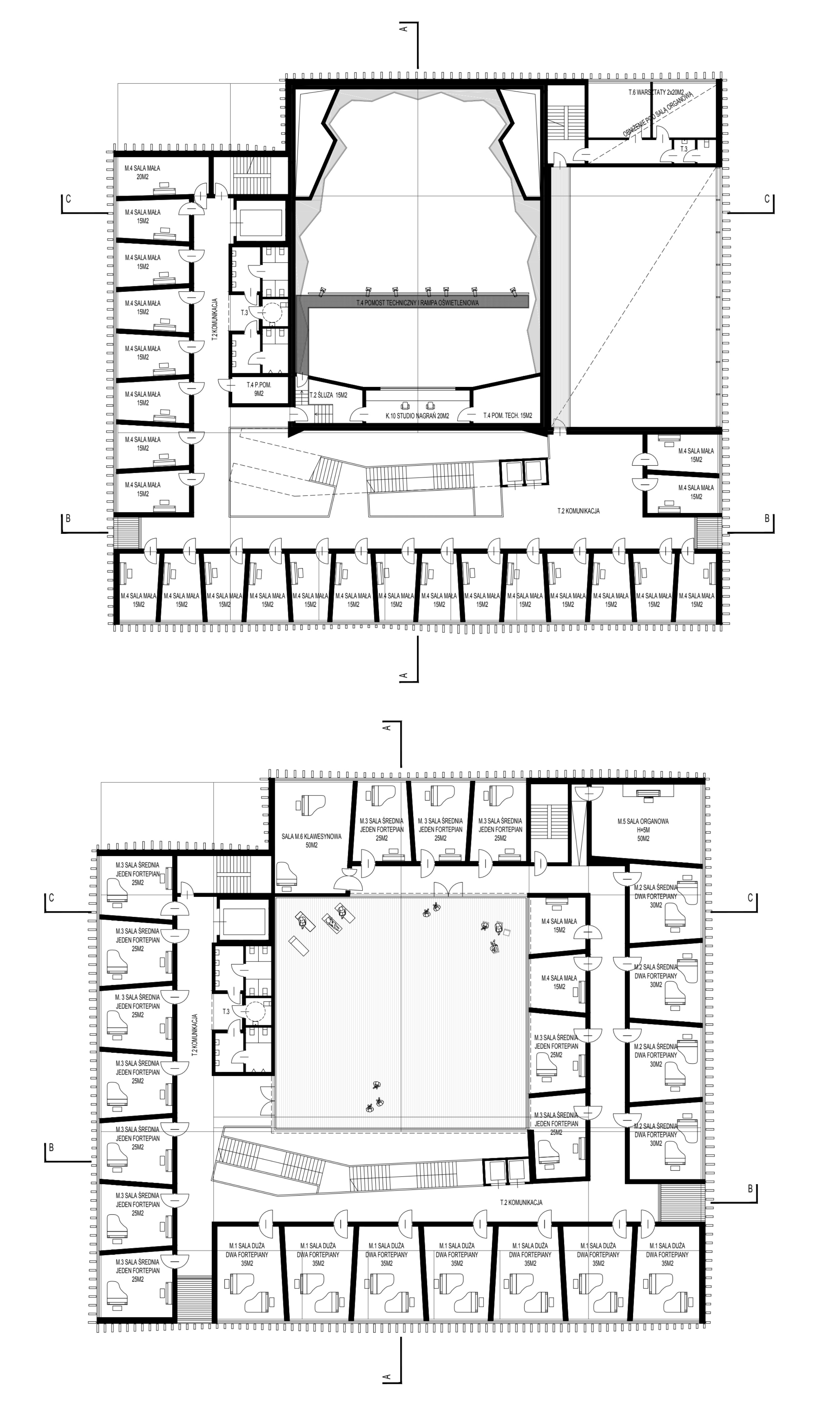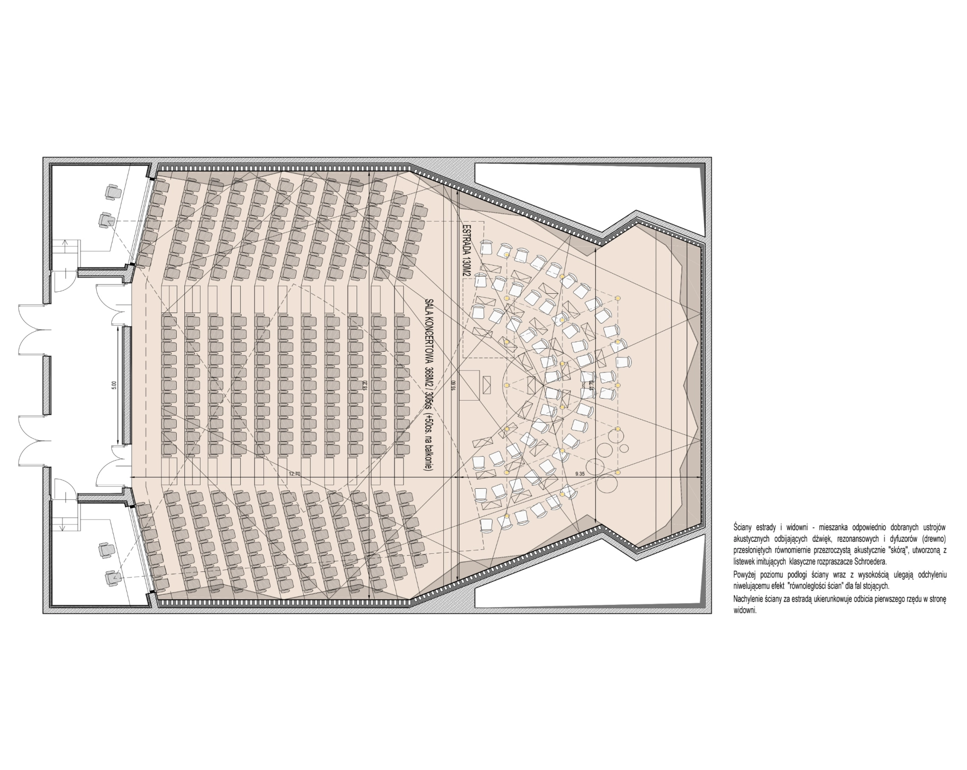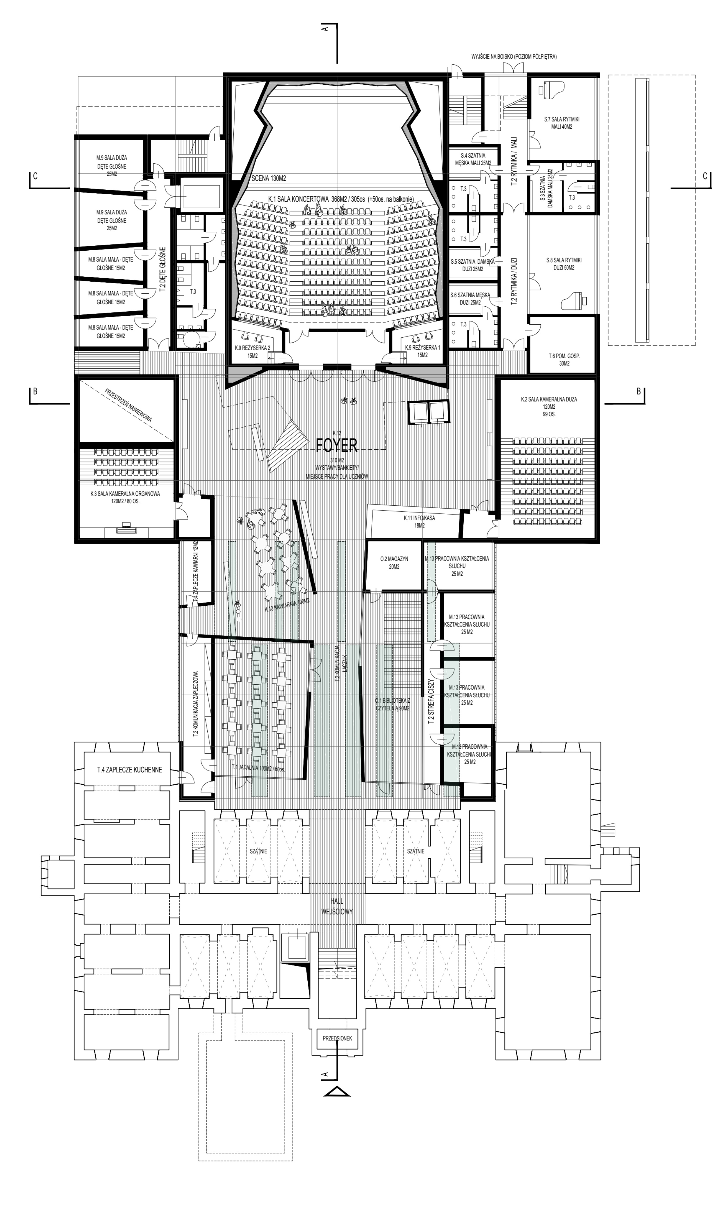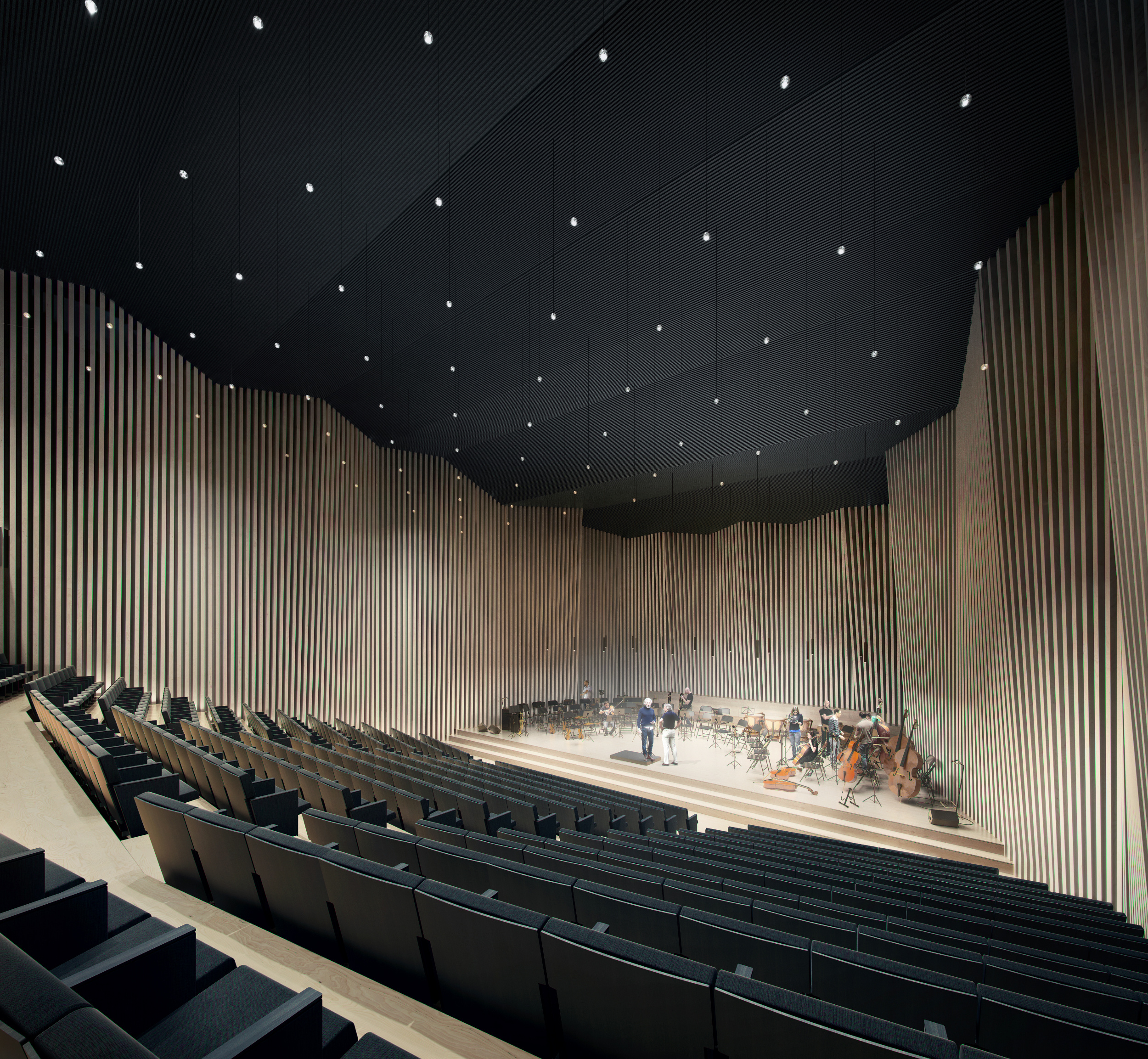 Główna sala koncertowa w układzie „shoe-box” to serce obiektu - akustycznie precyzyjne „pudełko w pudełku” z 355 miejscami. Uzupełniają ją mniejsze sale kameralne i organowa, zapewniające elastyczność funkcjonalną oraz zróżnicowane warunki akustyczne.