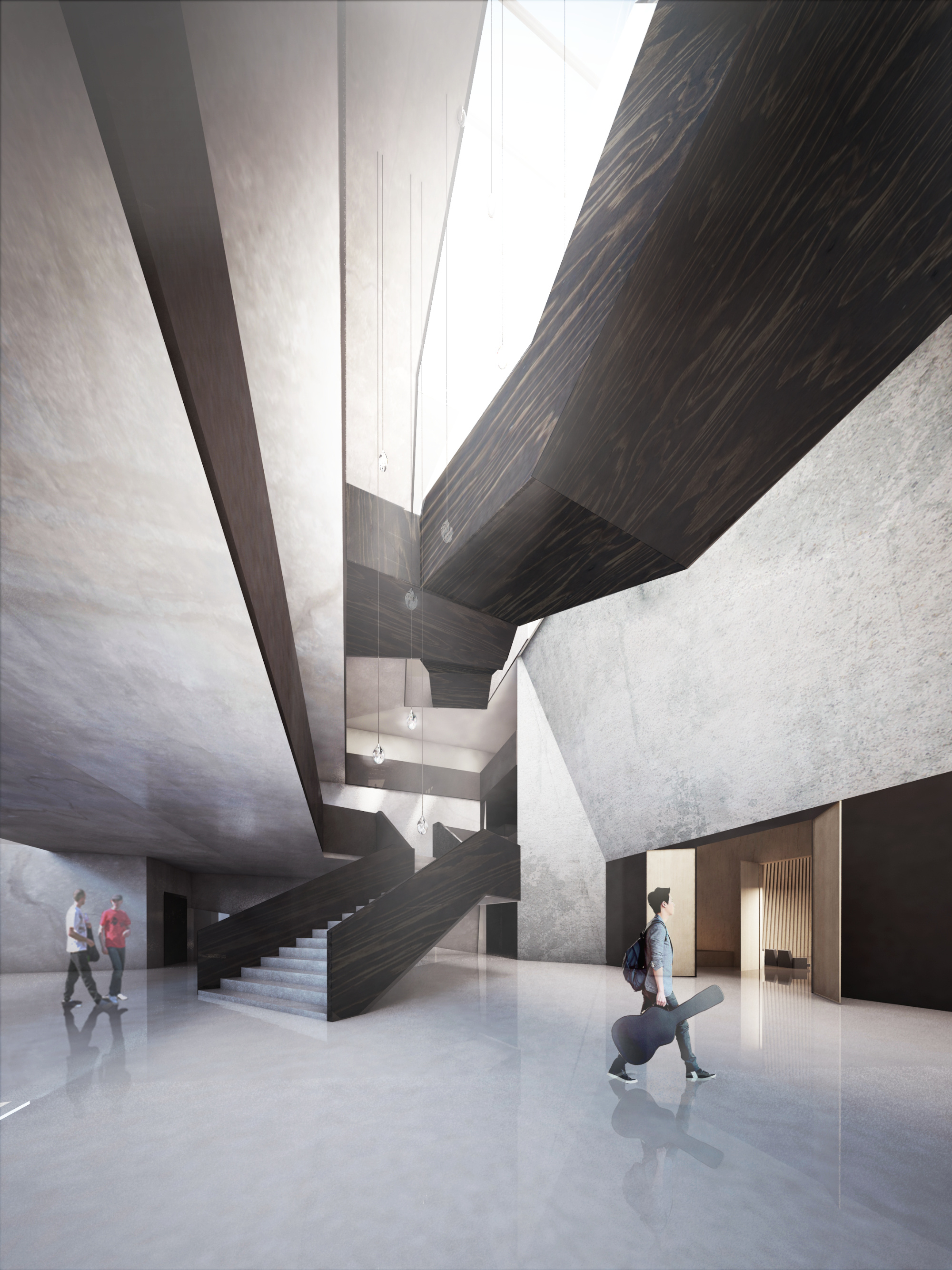 Wnętrza cechuje asceza materiałów - beton, szkło i jasne drewno budują przestrzeń o klarownym rytmie i doskonałej akustyce. Centralne foyer, otwarte na kondygnacje, pełni rolę łącznika i miejsca spotkań uczniów oraz gości.