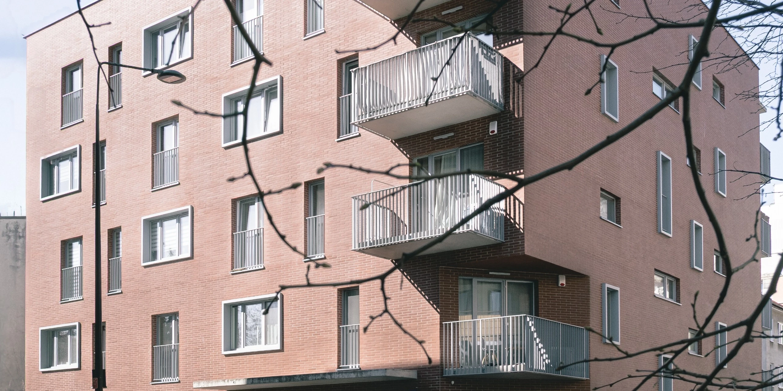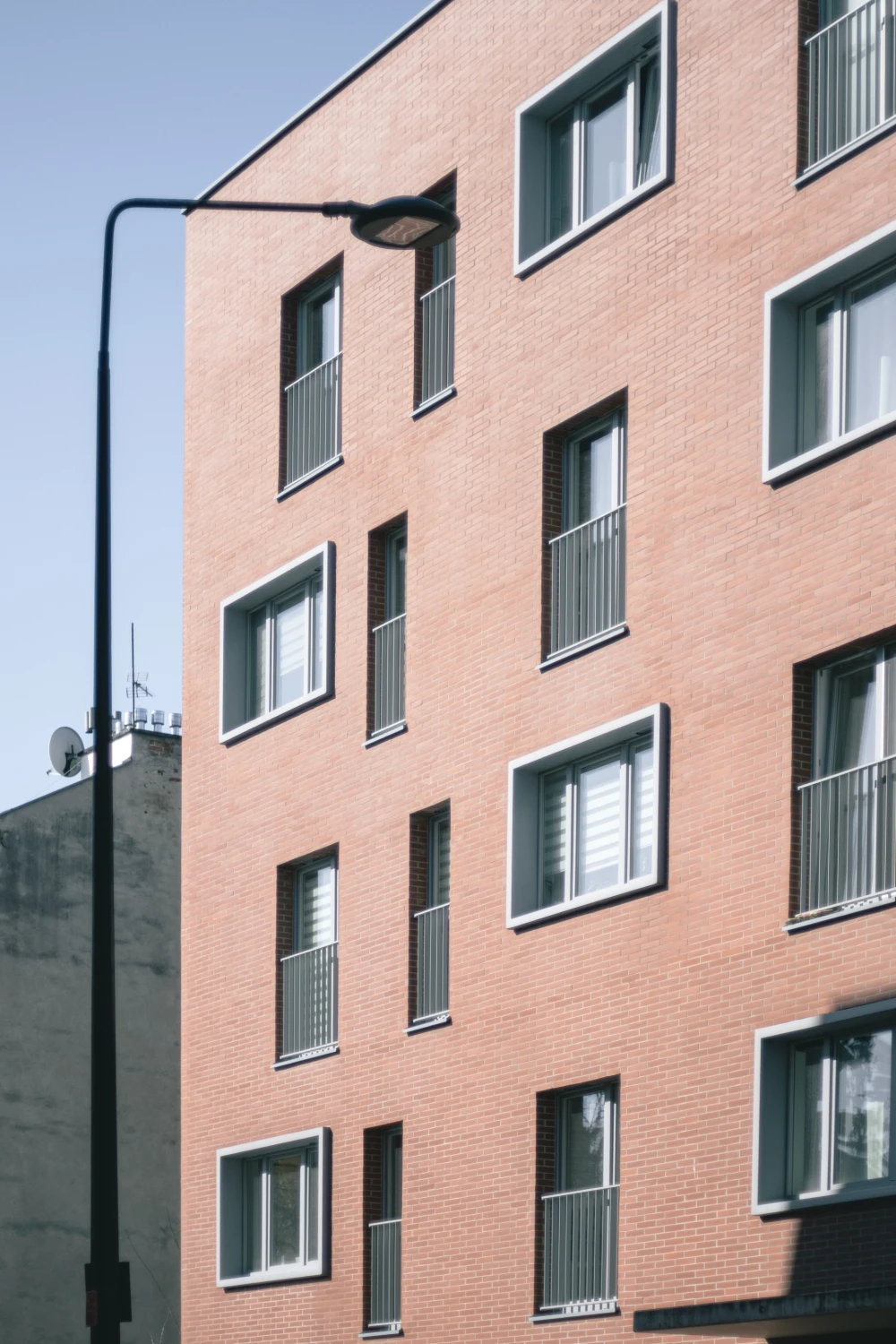 Pomimo powtarzalnego układu mieszkań, elewacja budynku zyskuje indywidualny charakter dzięki zróżnicowanemu rytmowi okien oraz wystającym ramom w glifach. Czerwona, klinkierowa okładzina elewacyjna nadaje budynkowi elegancji i głębi, a drobne przesunięcia i niuanse kompozycyjne wzbogacają jego odbiór w przestrzeni miejskiej.