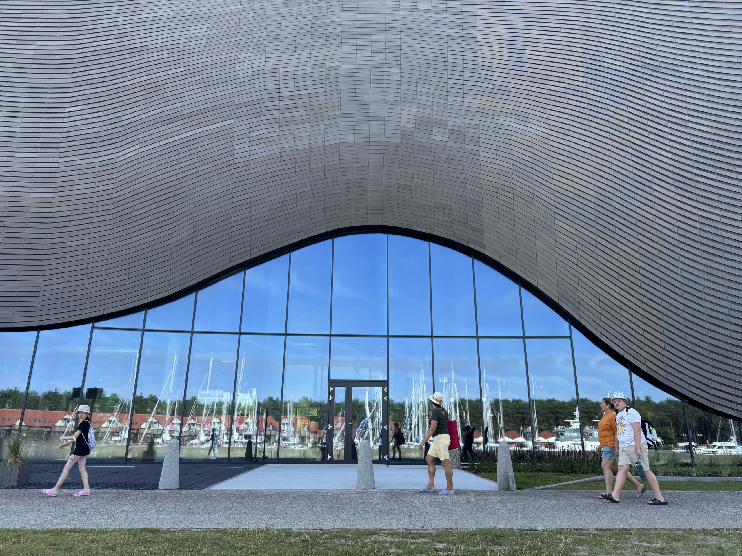 Nasz projekt - wyłoniony w ogólnopolskim konkursie - zakłada zwartą, dynamiczną bryłę budynku z wyrazistą elewacją, która poprzez swoją formę nawiązuje do naturalnego krajobrazu nadmorskiego: nurtu rzeki Łeby, ruchu fal, kadłuba statku oraz charakterystycznych wydm.