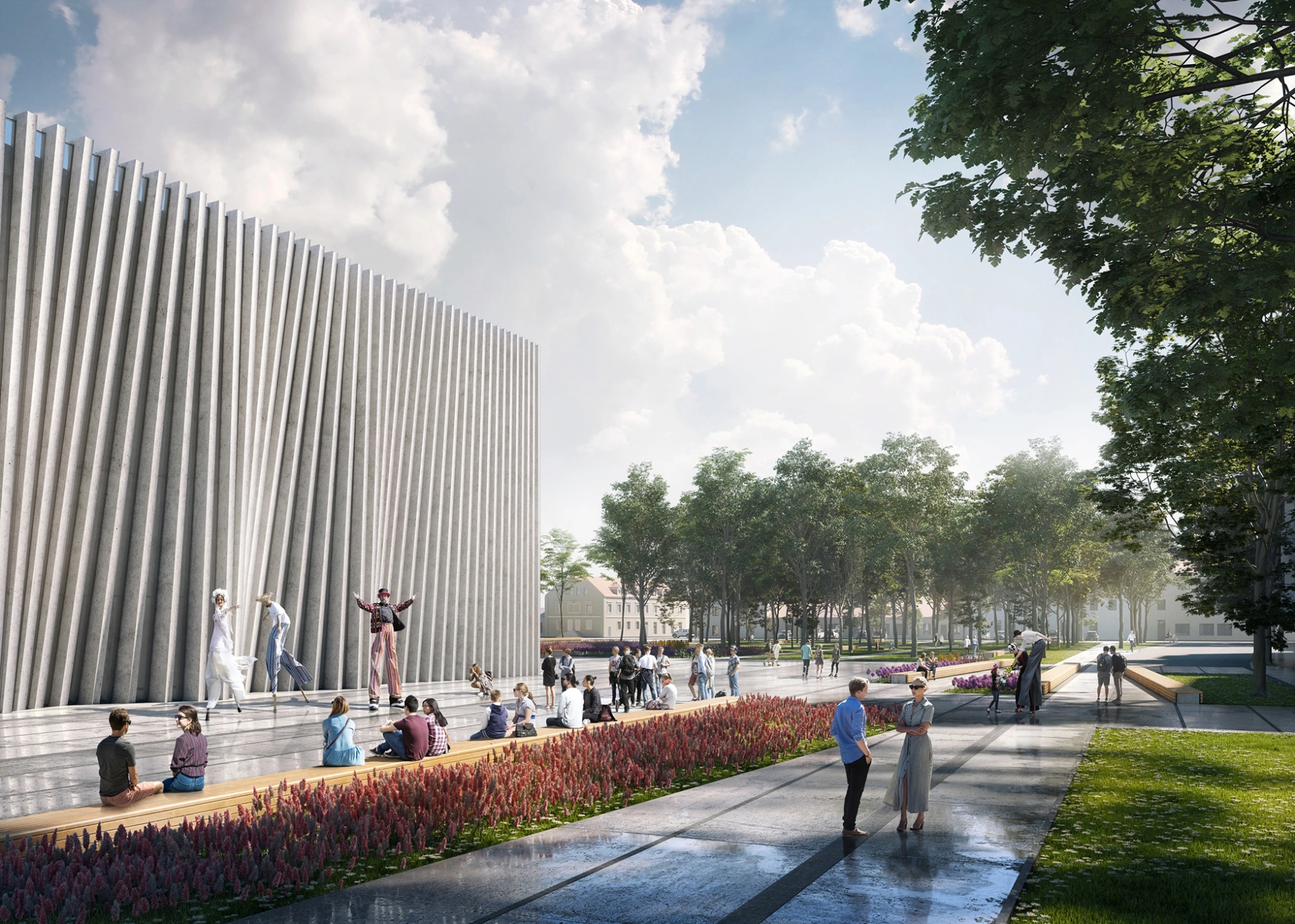 Między nowym budynkiem a Teatrem Dramatycznym powstała kluczowa przestrzeń całego układu - nowa, symboliczna brama miasta. To przede wszystkim terytorium wspólnych działań dwóch instytucji kultury, zaprojektowany z myślą o wydarzeniach plenerowych: wystawach, paradach, działaniach teatralnych i muzycznych. Choć cała bryła obłożona jest jasnymi lamelami i lustrzanymi przeszkleniami, to właśnie tu elewacja nabiera największej ekspresji - struktura rozpięta między dwoma wejściami wznosi się w kierunku teatru. Ten gest przestrzenny podkreśla otwartość i tworzy dynamiczny, nowoczesny portal miejski.