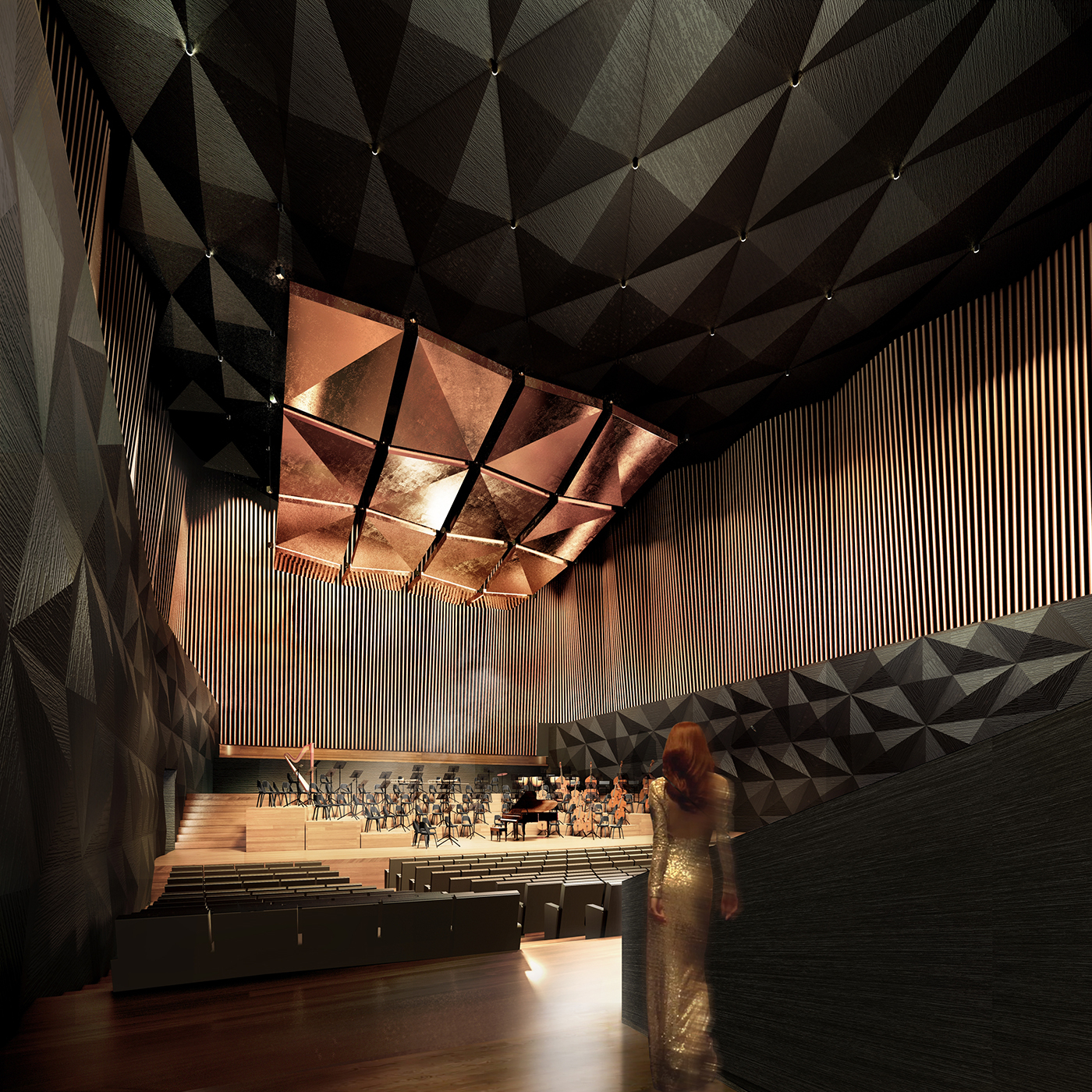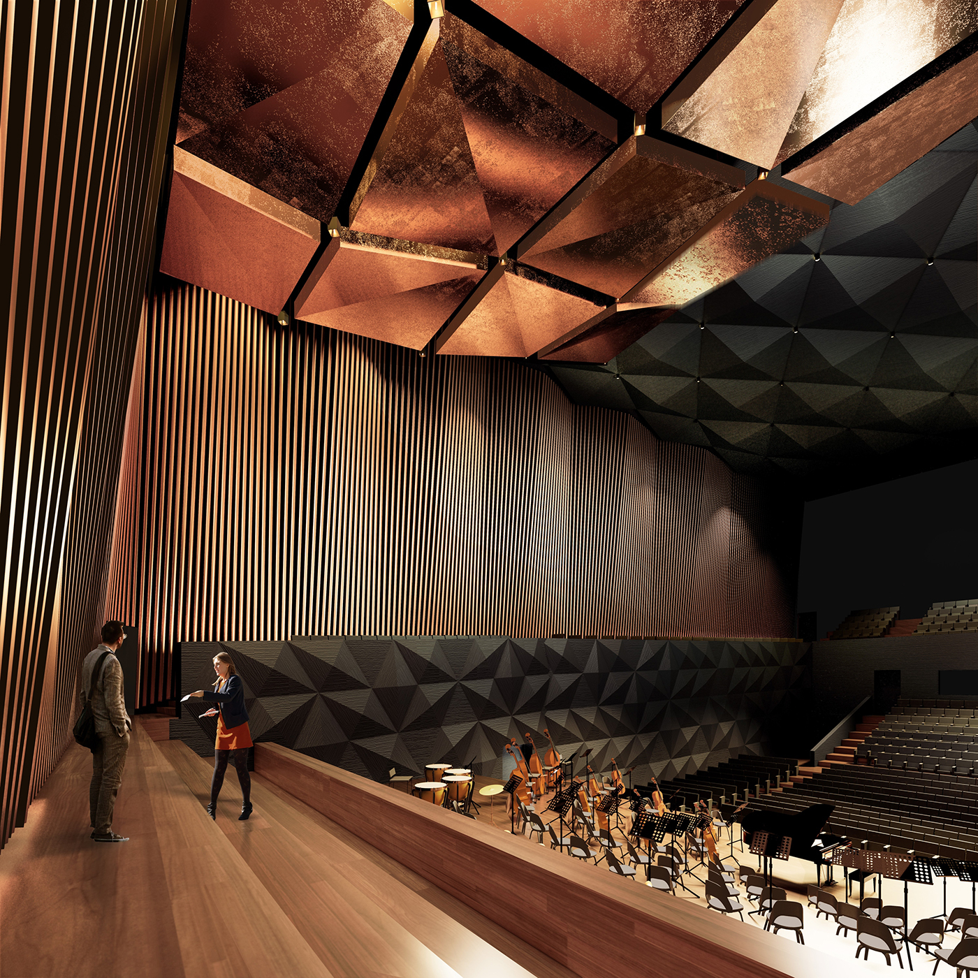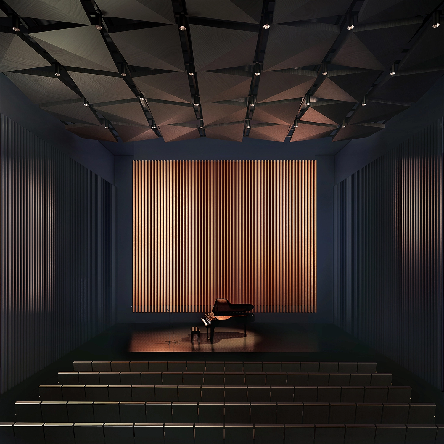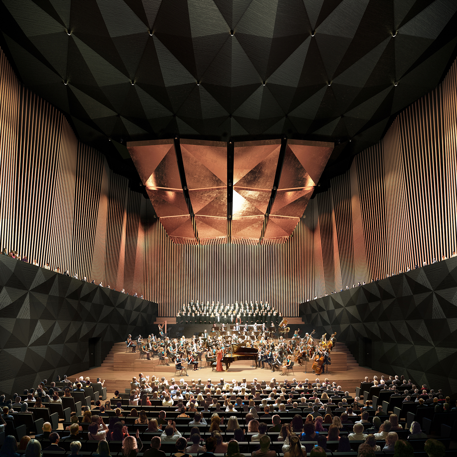 Wnętrze sali koncertowej oparliśmy na klasycznym układzie shoe-box, który zapewnia optymalne warunki akustyczne. Wystrój sali utrzymany jest w stonowanej, eleganckiej stylistyce.