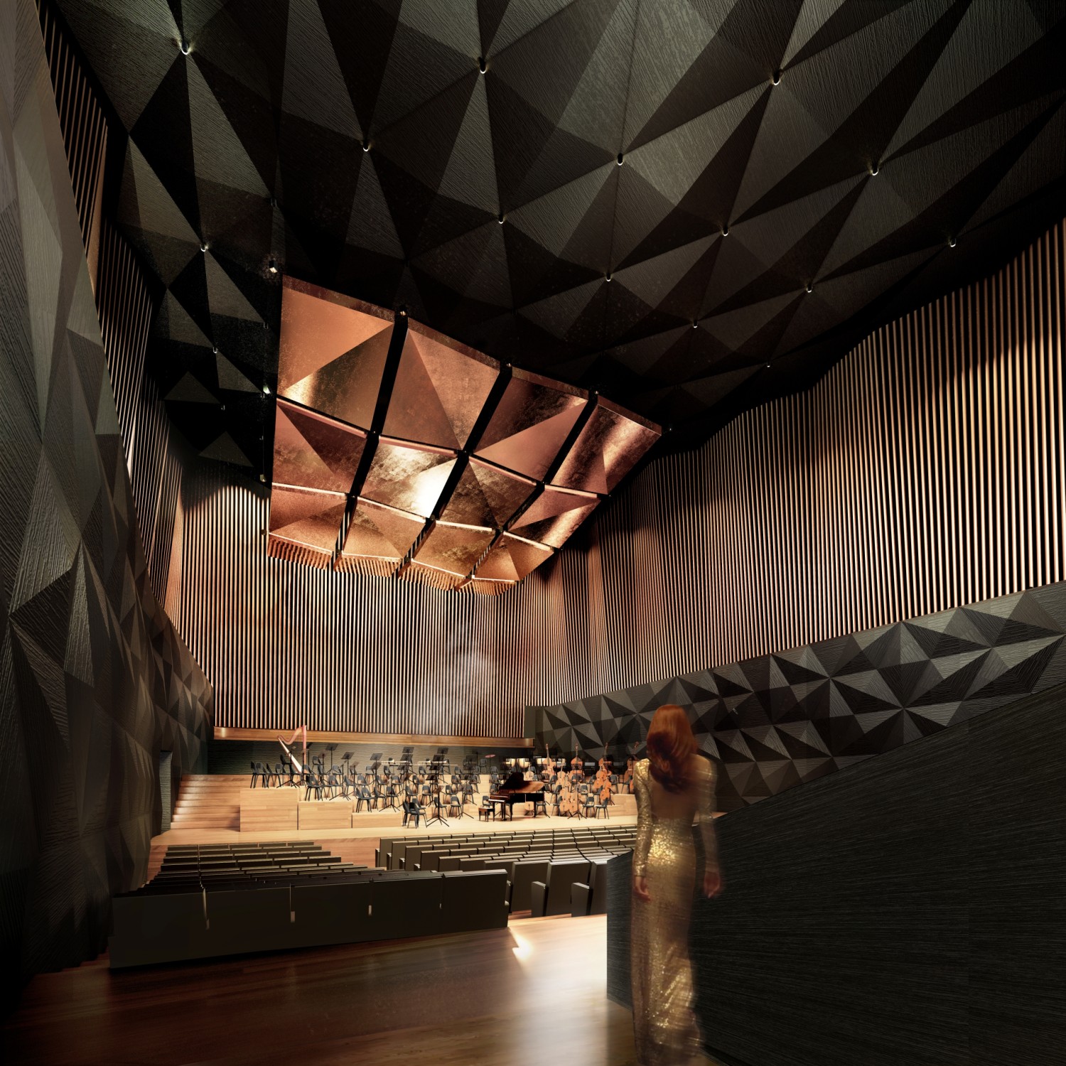Wnętrze sali koncertowej oparliśmy na klasycznym układzie shoe-box, który zapewnia optymalne warunki akustyczne. Wystrój sali utrzymany jest w stonowanej, eleganckiej stylistyce.